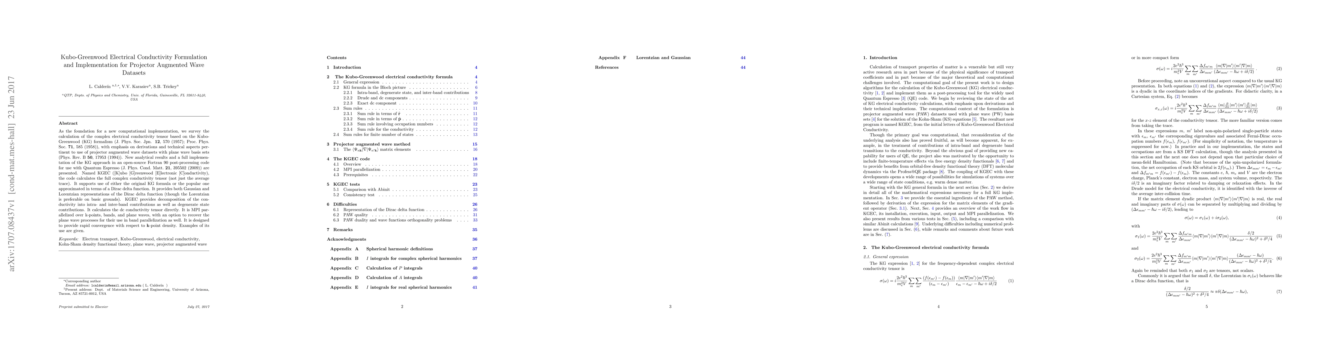 This paper develops a computational implementation of Kubo-Greenwood electrical conductivity formulation for projector augmented wave datasets, providing a full complex conductivity tensor calculation and supporting parallelization over k-points, bands, and plane waves.