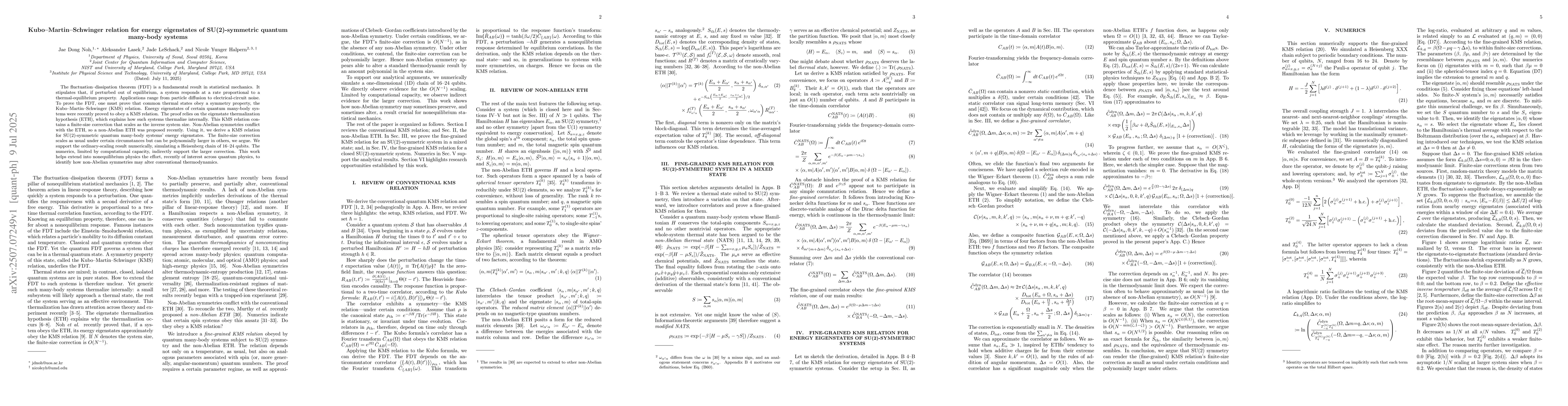 The fluctuation-dissipation theorem (FDT) is a fundamental result in statistical mechanics. It stipulates that, if perturbed out of equilibrium, a system responds at a rate proportional to a thermal-equilibrium property. Applications range from particle diffusion to electrical-circuit noise. To prove the FDT, one must prove that common thermal states obey a symmetry property, the Kubo-Martin-Schwinger (KMS) relation. Energy eigenstates of certain quantum many-body systems were recently proved to obey the KMS relation. The proof relies on the eigenstate thermalization hypothesis (ETH), which explains how such systems thermalize internally. This KMS relation contains a finite-size correction that scales as the inverse system size. Non-Abelian symmetries conflict with the ETH, so a non-Abelian ETH was proposed recently. Using it, we derive a KMS relation for SU(2)-symmetric quantum many-body systems' energy eigenstates. The finite-size correction scales as usual under certain circumstances but can be polynomially larger in others, we argue. We support the ordinary-scaling result numerically, simulating a Heisenberg chain of 16-24 qubits. The numerics, limited by computational capacity, indirectly support the larger correction. This work helps extend into nonequilibrium physics the effort, recently of interest across quantum physics, to identify how non-Abelian symmetries may alter conventional thermodynamics.