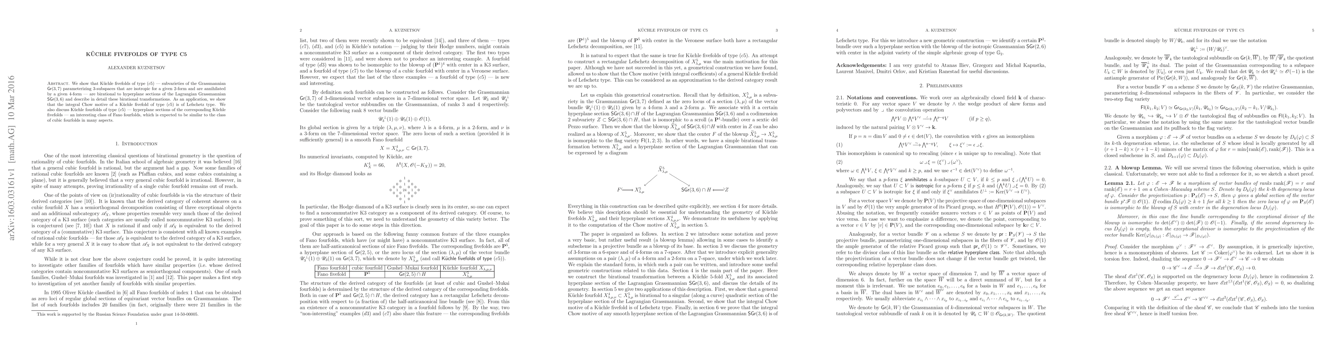 This paper demonstrates the birational equivalence between Küchle fivefolds of type c5, which are subvarieties of the Grassmannian Gr(3,7), and hyperplane sections of the Lagrangian Grassmannian LGr(3,6). It also establishes that the integral Chow motive of these Küchle fivefolds is of Lefschetz type and discusses related Küchle fourfolds as a class of Fano fourfolds.