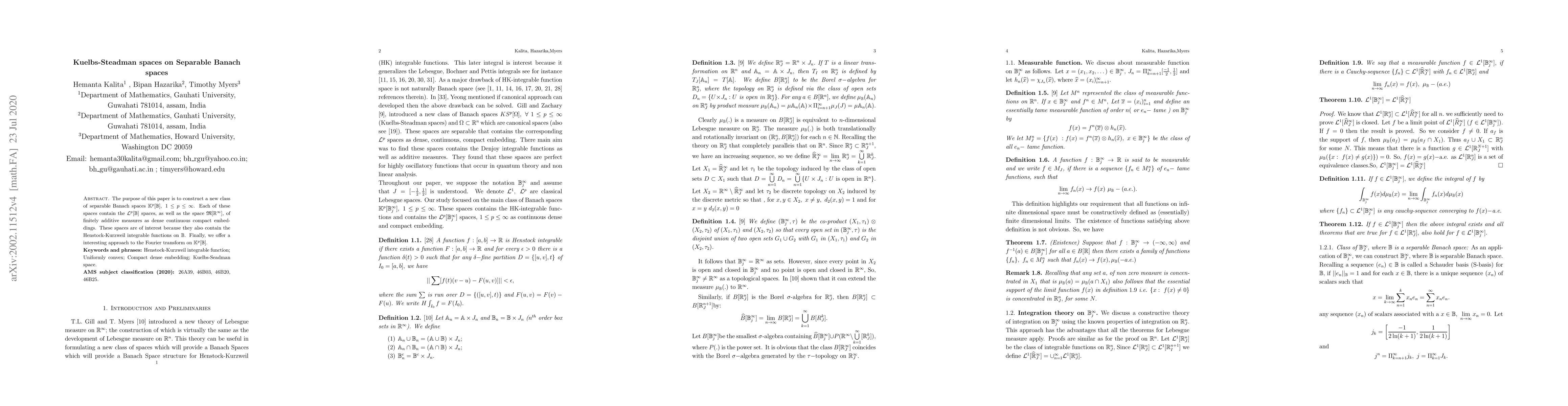 The purpose of this paper is to construct a new class of separable Banach spaces $\K^p[\mathbb{B}], \; 1\leq p \leq \infty$. Each of these spaces contain the $ \mcL^p[\mathbb{B}] $ spaces, as well as the space $\mfM[\R^\iy]$, of finitely additive measures as dense continuous compact embeddings. These spaces are of interest because they also contain the Henstock-Kurzweil integrable functions on $\mathbb{B}$. Finally, we offer a interesting approach to the Fourier transform on $\K^p[\mathbb{B}].$