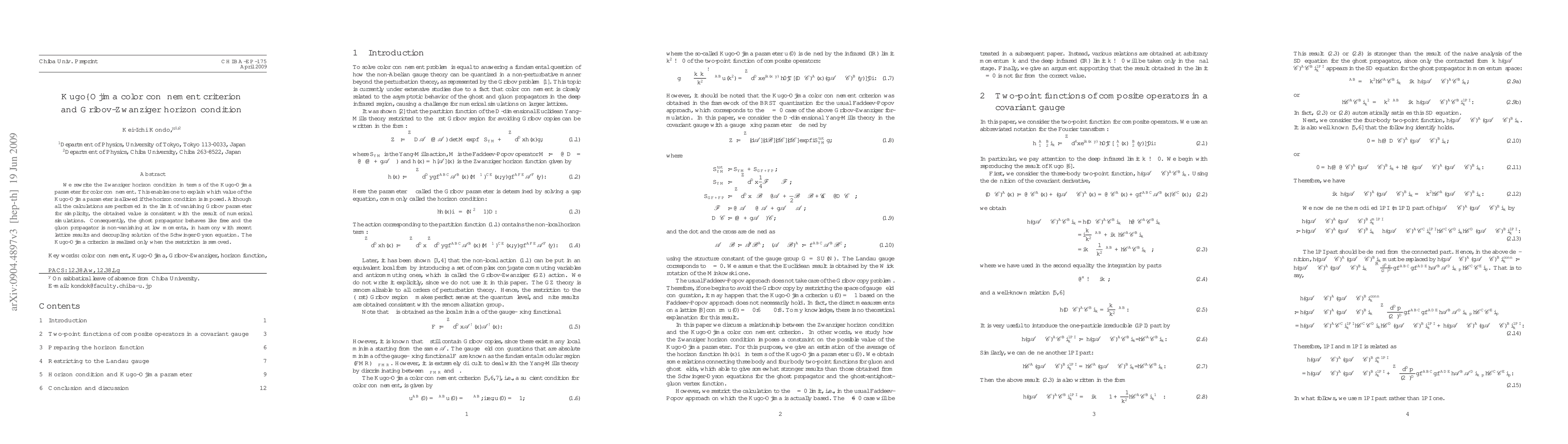 This paper connects the Zwanziger horizon condition with the Kugo-Ojima parameter to determine the allowed values for color confinement, showing consistency with numerical simulations. The ghost propagator behaves freely, and the gluon propagator remains non-vanishing at low momenta, aligning with recent lattice results and the Schwinger-Dyson equation.