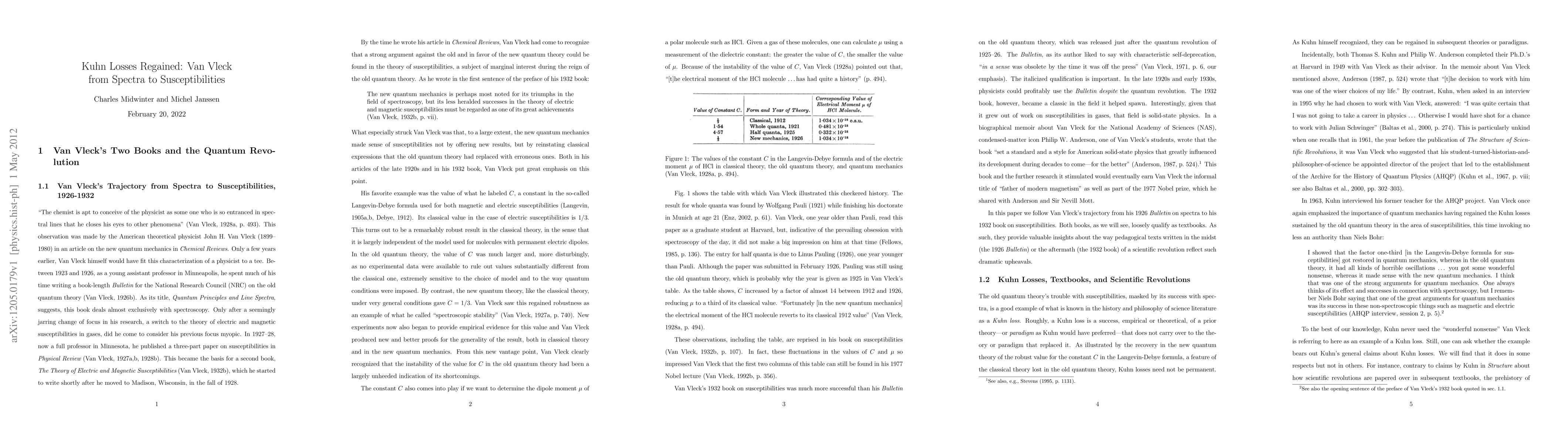 We follow the trajectory of John H. Van Vleck from his 1926 Bulletin for the National Research Council (NRC) on the old quantum theory to his 1932 book, The Theory of Electric and Magnetic Susceptibilities. We highlight the continuity of formalism and technique in the transition from dealing with spectra in the old quantum theory to dealing with susceptibilities in the new quantum mechanics. Our main focus is on the checkered history of a numerical factor in the Langevin-Debye formula for the electric susceptibility of gases. Classical theory predicts that this factor is equal to 1/3. The old quantum theory predicted values up to 14 times higher. Van Vleck showed that quantum mechanics does away with this "wonderful nonsense" (as Van Vleck called it) and restores the classical value 1/3. The Langevin-Debye formula thus provides an instructive example of a Kuhn loss in one paradigm shift that was regained in the next. In accordance with Kuhn's expectation that textbooks sweep Kuhn losses under the rug, Van Vleck did not mention this particular Kuhn loss anywhere in his 1926 NRC Bulletin (though he prominently did flag a Kuhn loss in dispersion theory that had recently been regained). Contrary to Kuhn's expectations, however, he put the regained Kuhn loss in susceptibility theory to good pedagogical use in his 1932 book. Kuhn claimed that textbooks must suppress, truncate, and/or distort the prehistory of their subject matter if they are to inculcate the exemplars of the new paradigm in their readers. This claim is not borne out in this case. Because of the continuity of formalism and technique that we draw attention to that Van Vleck could achieve his pedagogical objectives in his 1932 book even though he devoted about a third of it to the treatment of susceptibilities in classical theory and the old quantum theory in a way that matches the historical record reasonably well.