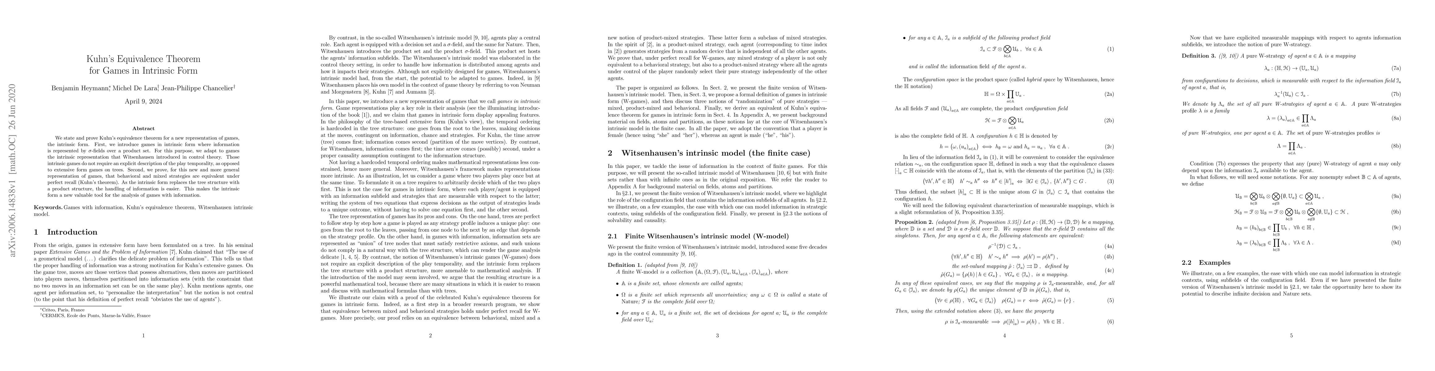 This paper introduces and proves Kuhn's equivalence theorem for games represented in intrinsic form, where information is depicted via $\sigma$-fields over a product set. It demonstrates that behavioral and mixed strategies are equivalent under perfect recall, offering a more flexible and information-handling-friendly alternative to extensive form games.