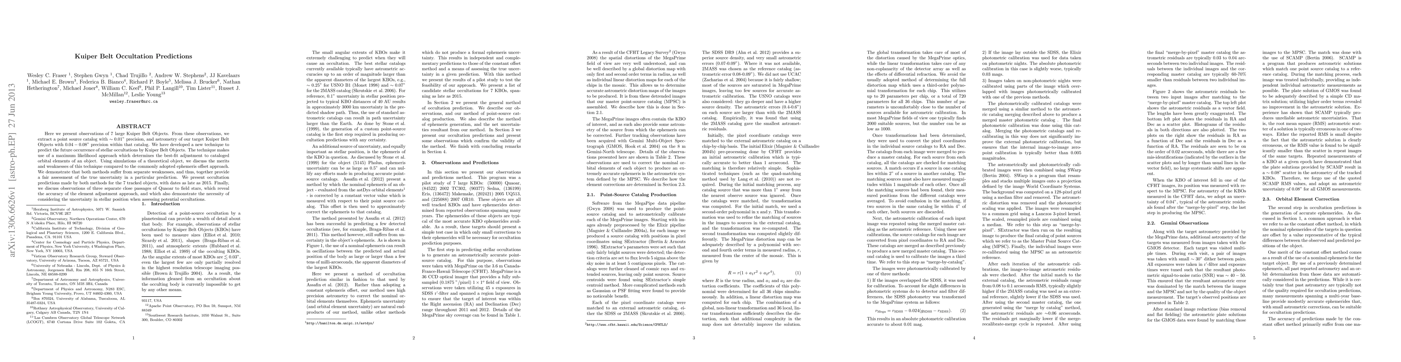 This paper presents observations of 7 large Kuiper Belt Objects, developing a new technique for predicting stellar occultations using a maximum likelihood approach. It compares this method with the ephemeris offset approach, demonstrating both have distinct weaknesses, and provides predictions for occultations up to 2015.