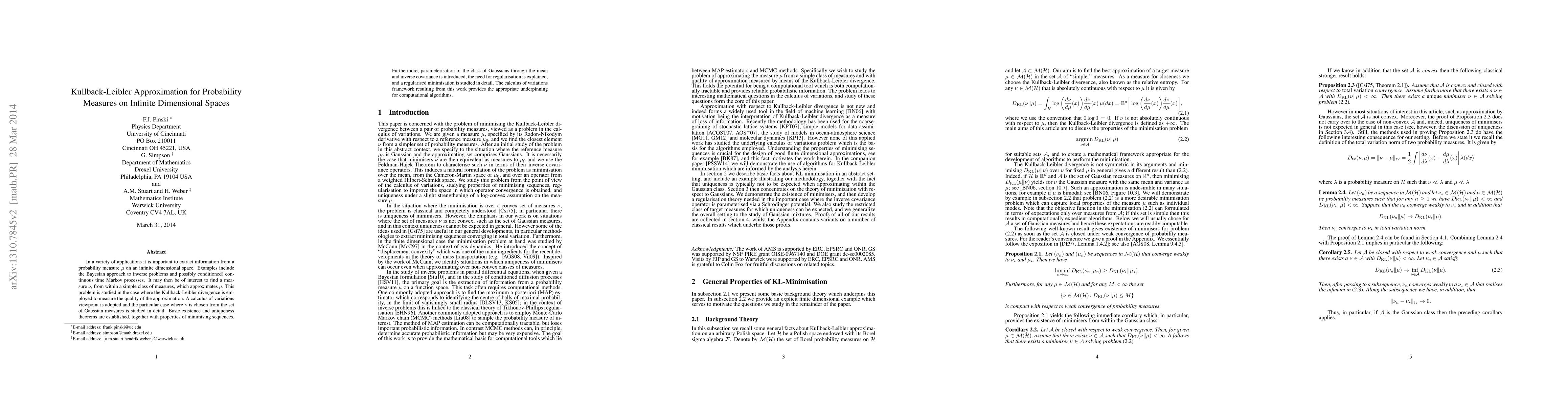 In a variety of applications it is important to extract information from a probability measure $\mu$ on an infinite dimensional space. Examples include the Bayesian approach to inverse problems and possibly conditioned) continuous time Markov processes. It may then be of interest to find a measure $\nu$, from within a simple class of measures, which approximates $\mu$. This problem is studied in the case where the Kullback-Leibler divergence is employed to measure the quality of the approximation. A calculus of variations viewpoint is adopted and the particular case where $\nu$ is chosen from the set of Gaussian measures is studied in detail. Basic existence and uniqueness theorems are established, together with properties of minimising sequences. Furthermore, parameterisation of the class of Gaussians through the mean and inverse covariance is introduced, the need for regularisation is explained, and a regularised minimisation is studied in detail. The calculus of variations framework resulting from this work provides the appropriate underpinning for computational algorithms.
