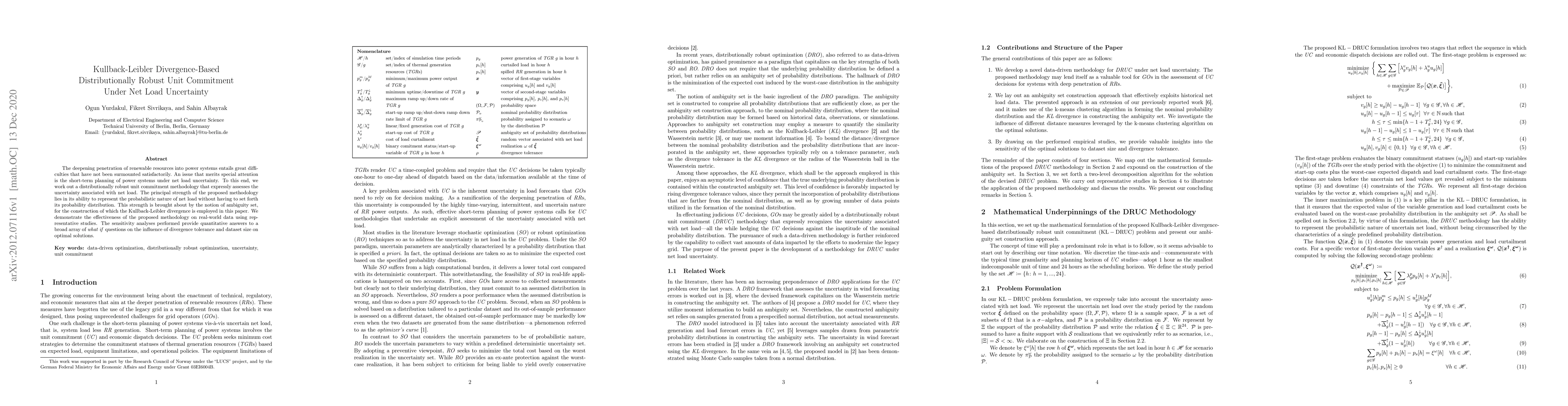 The deepening penetration of renewable resources into power systems entails great difficulties that have not been surmounted satisfactorily. An issue that merits special attention is the short-term planning of power systems under net load uncertainty. To this end, we work out a distributionally robust unit commitment methodology that expressly assesses the uncertainty associated with net load. The principal strength of the proposed methodology lies in its ability to represent the probabilistic nature of net load without having to set forth its probability distribution. This strength is brought about by the notion of ambiguity set, for the construction of which the Kullback-Leibler divergence is employed in this paper. We demonstrate the effectiveness of the proposed methodology on real-world data using representative studies. The sensitivity analyses performed provide quantitative answers to a broad array of what if questions on the influence of divergence tolerance and dataset size on optimal solutions.