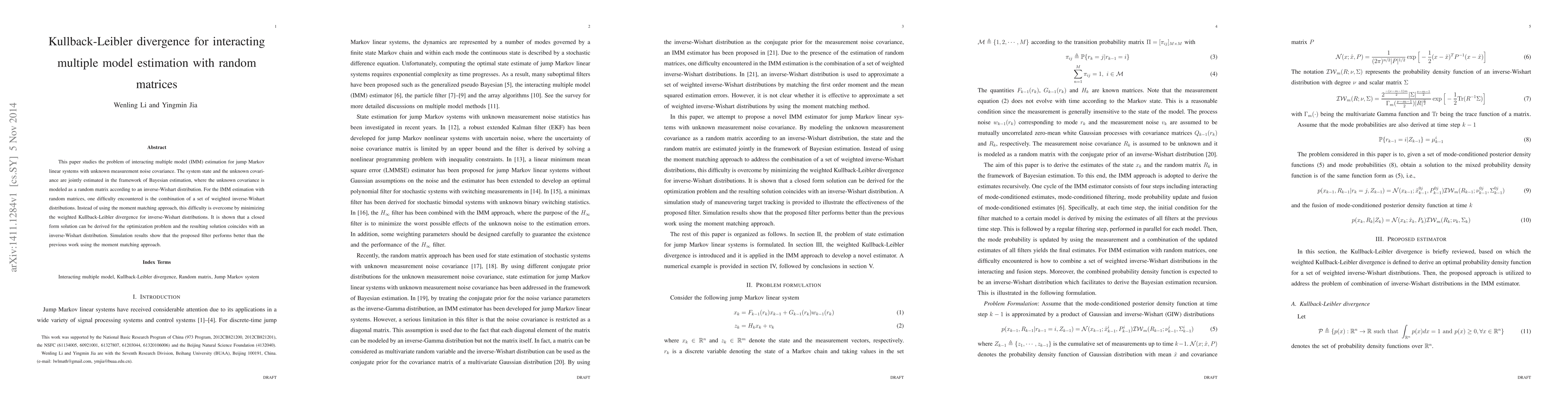 This paper studies the problem of interacting multiple model (IMM) estimation for jump Markov linear systems with unknown measurement noise covariance. The system state and the unknown covariance are jointly estimated in the framework of Bayesian estimation, where the unknown covariance is modeled as a random matrix according to an inverse-Wishart distribution. For the IMM estimation with random matrices, one difficulty encountered is the combination of a set of weighted inverse-Wishart distributions. Instead of using the moment matching approach, this difficulty is overcome by minimizing the weighted Kullback-Leibler divergence for inverse-Wishart distributions. It is shown that a closed form solution can be derived for the optimization problem and the resulting solution coincides with an inverse-Wishart distribution. Simulation results show that the proposed filter performs better than the previous work using the moment matching approach.