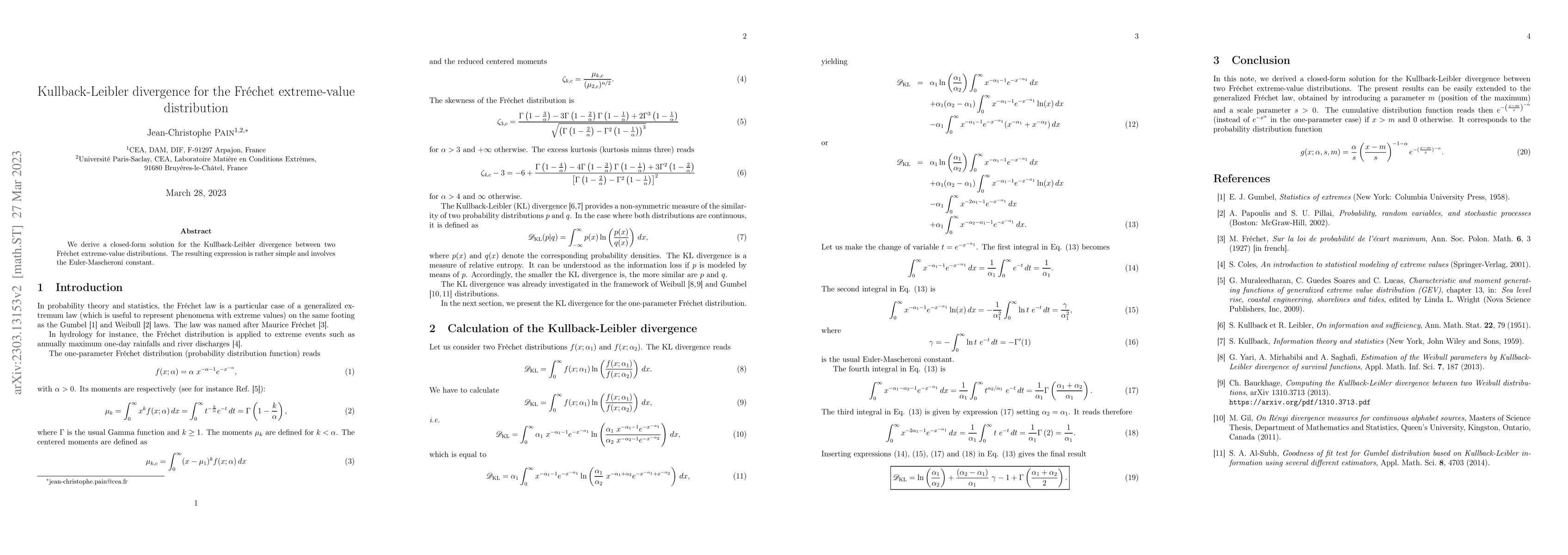Summary: This paper presents a closed-form solution for the Kullback-Leibler divergence between two Fr\'echet extreme-value distributions, yielding a simple expression that incorporates the Euler-Mascheroni constant.