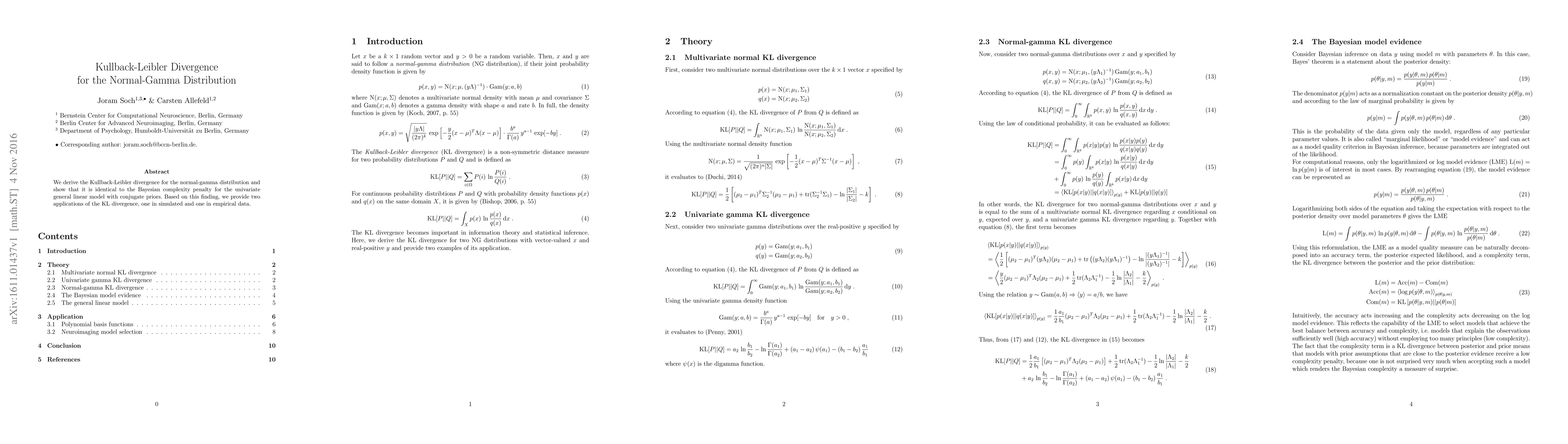 This paper derives the Kullback-Leibler divergence for the normal-gamma distribution and demonstrates its equivalence to the Bayesian complexity penalty for the univariate general linear model with conjugate priors. The study also applies this divergence in both simulated and empirical data analyses.