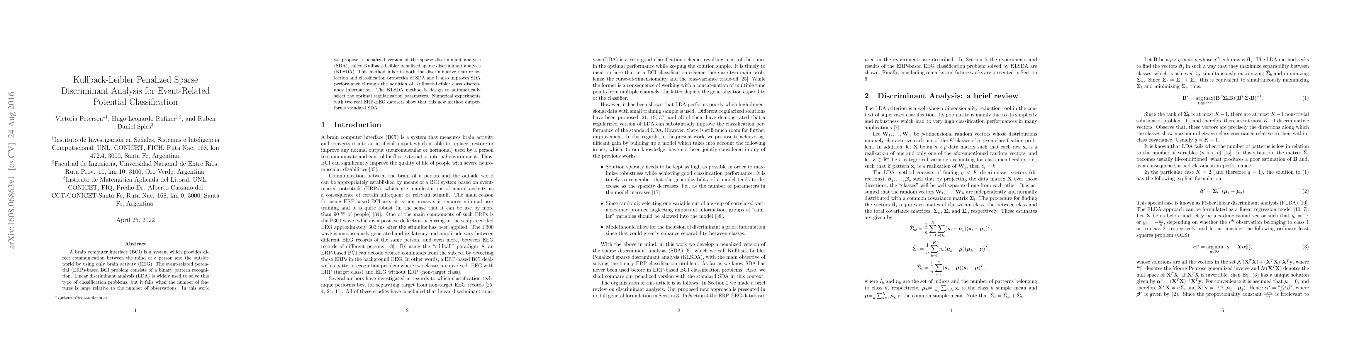 This paper proposes a Kullback-Leibler penalized sparse discriminant analysis (KLSDA) method for classifying event-related potentials in brain-computer interfaces. It improves upon sparse discriminant analysis by incorporating Kullback-Leibler class discrepancy information and automatically selecting optimal regularization parameters, outperforming standard SDA in experiments with real EEG datasets.