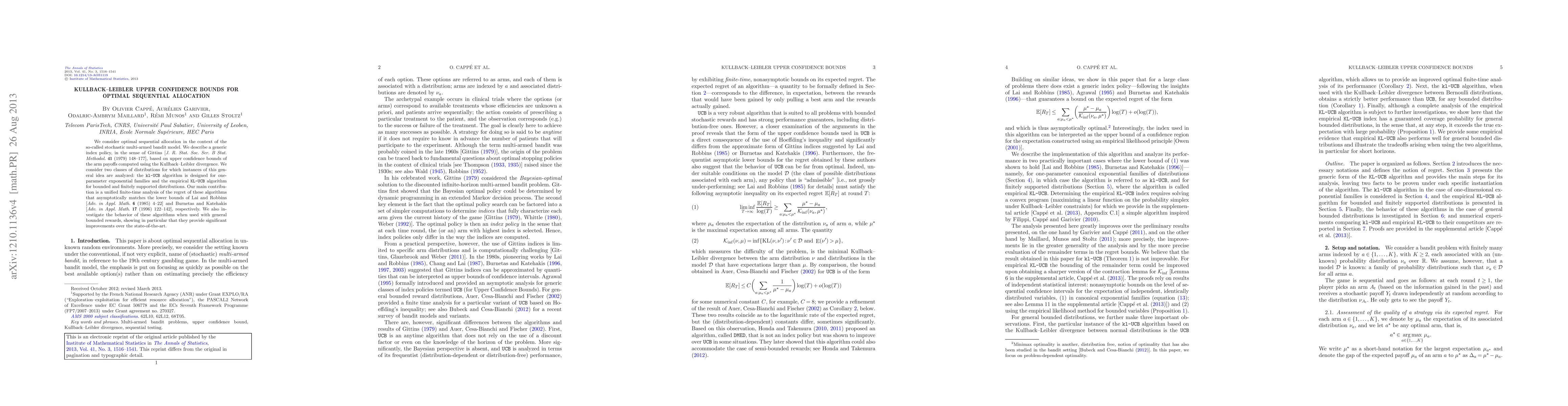 We consider optimal sequential allocation in the context of the so-called stochastic multi-armed bandit model. We describe a generic index policy, in the sense of Gittins [J. R. Stat. Soc. Ser. B Stat. Methodol. 41 (1979) 148-177], based on upper confidence bounds of the arm payoffs computed using the Kullback-Leibler divergence. We consider two classes of distributions for which instances of this general idea are analyzed: the kl-UCB algorithm is designed for one-parameter exponential families and the empirical KL-UCB algorithm for bounded and finitely supported distributions. Our main contribution is a unified finite-time analysis of the regret of these algorithms that asymptotically matches the lower bounds of Lai and Robbins [Adv. in Appl. Math. 6 (1985) 4-22] and Burnetas and Katehakis [Adv. in Appl. Math. 17 (1996) 122-142], respectively. We also investigate the behavior of these algorithms when used with general bounded rewards, showing in particular that they provide significant improvements over the state-of-the-art.