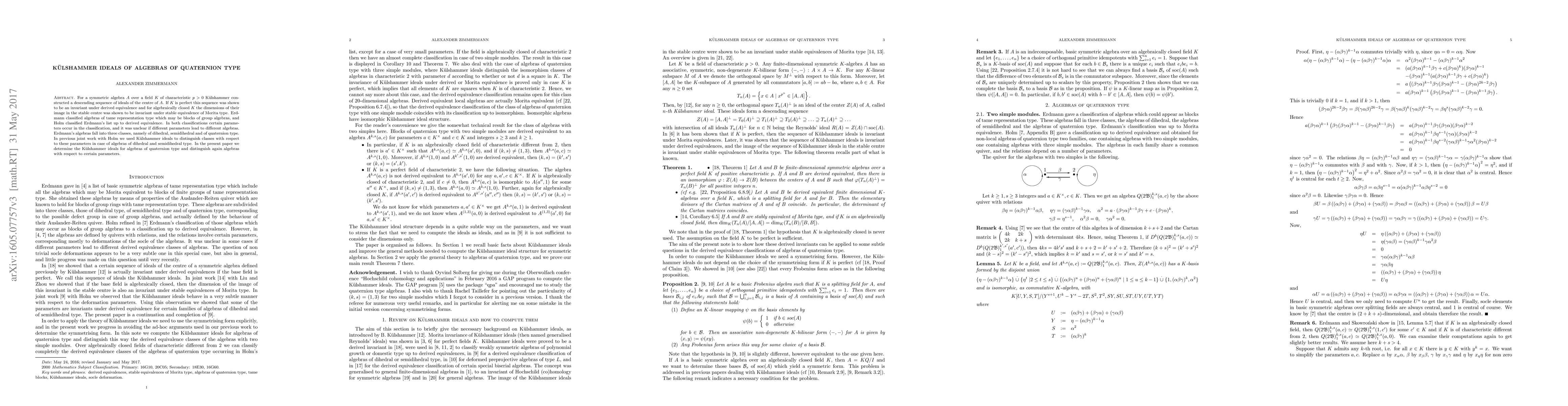For a symmetric algebra A over a field K of characteristic p > 0 K{\"u}lshammer constructed a descending sequence of ideals of the centre of A. If K is perfect this sequence was shown to be an invariant under derived equivalence and for algebraically closed K under stable equivalence of Morita type. Erdmann classified algebras of tame representation type which may be blocks of group algebras, and Holm classified Erdmann's list up to derived equivalence. In both classifications certain parameters occur in the classification, and it was unclear if different parameters lead to different algebras. Erdmann's algebras fall into three classes, namely of dihedral, semidihedral and of quaternion type. In previous joint work with Holm we used K{\"u}lshammer ideals to distinguish classes with respect to these parameters in case of algebras of dihedral and semidihedral type. In the present paper we determine the K{\"u}lshammer ideals for algebras of quaternion type and distinguish again algebras with respect to certain parameters.