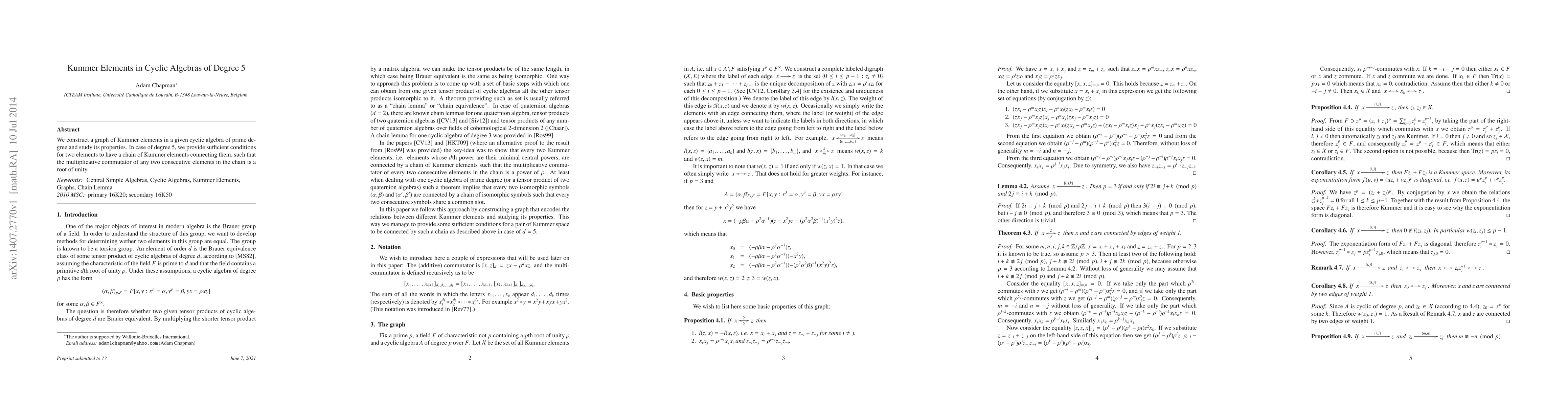 Summary: This paper constructs a graph of Kummer elements in cyclic algebras of degree 5 and investigates their properties, providing conditions for elements to be connected by a chain where the commutators of consecutive elements are roots of unity.