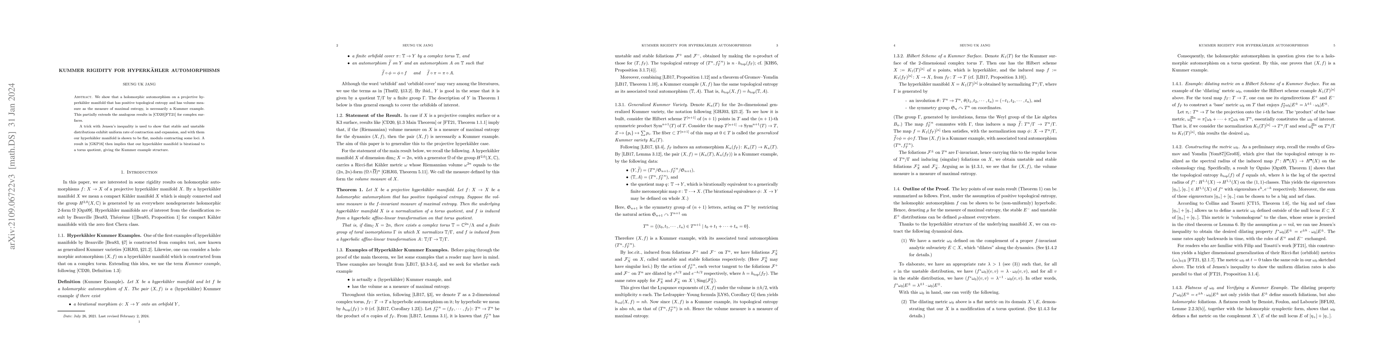 Summary: The paper demonstrates that holomorphic automorphisms on projective hyperkähler manifolds with positive topological entropy and volume measure as maximal entropy are Kummer examples. This extends previous results for complex surfaces, using Jensen's inequality to show uniform contraction and expansion rates, and employing a birational result to establish the Kummer structure.