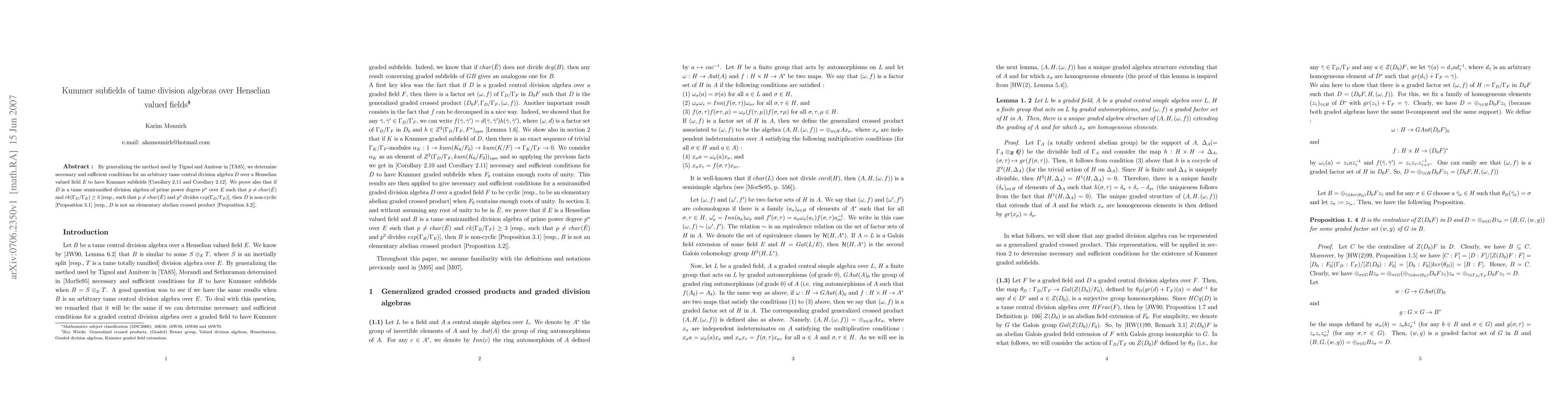 By generalizing the method used by Tignol and Amitsur in [TA85], we determine necessary and sufficient conditions for an arbitrary tame central division algebra D over a Henselian valued field E to have Kummer subfields [Corollary 2.11 and Corollary 2.12]. We prove also that if D is a tame semiramified division algebra of prime power degree p^n over E such that p\neq char(\bar E) and rk(\Gamma_D/\Gamma_E)\geq 3 [resp., such that p\neq char(\bar E) and p^3 divides exp(\Gamma_D/\Gamma_E)], then D is non-cyclic [Proposition 3.1] [resp., D is not an elementary abelian crossed product [Proposition 3.2]].