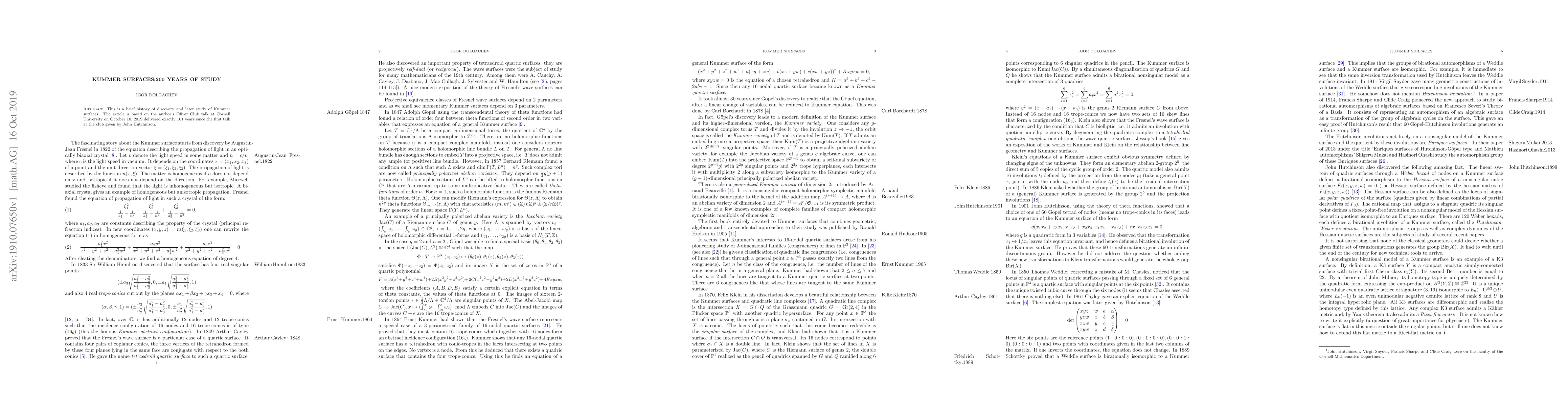 This is a brief history of discovery and later study of Kummer surfaces. The article is based on the author's Oliver Club talk at Cornell University on October 10, 2019 delivered exactly 101 years since the first talk at the club given by John Hutchinson.