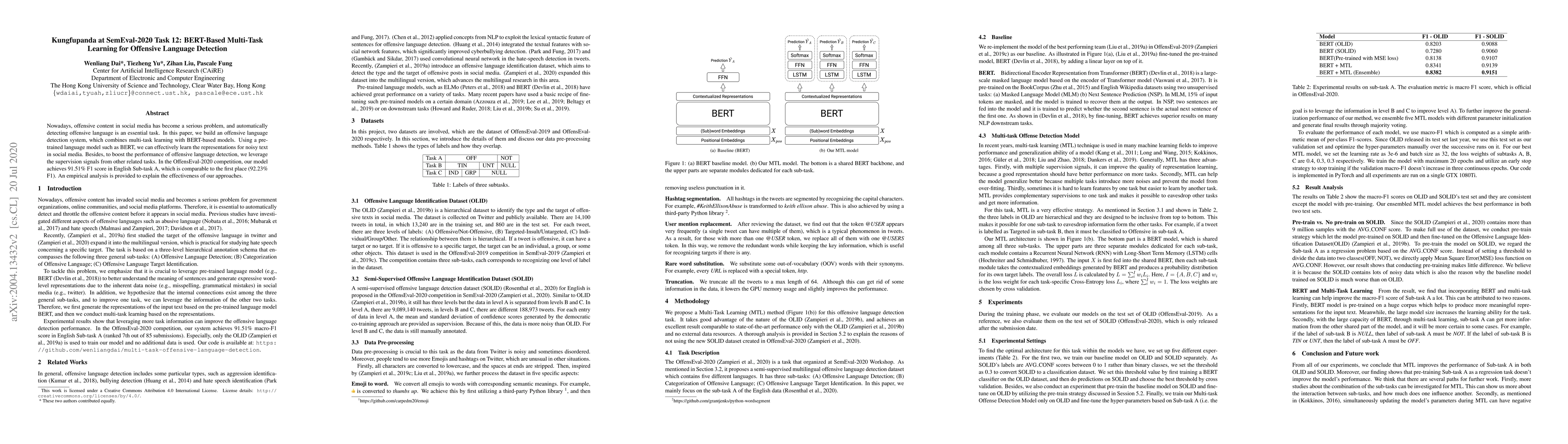 This research presents a BERT-based multi-task learning system for detecting offensive language in social media, achieving a competitive F1 score of 91.51% in the OffensEval-2020 competition. The study leverages pre-trained language models and additional related tasks to enhance detection performance.