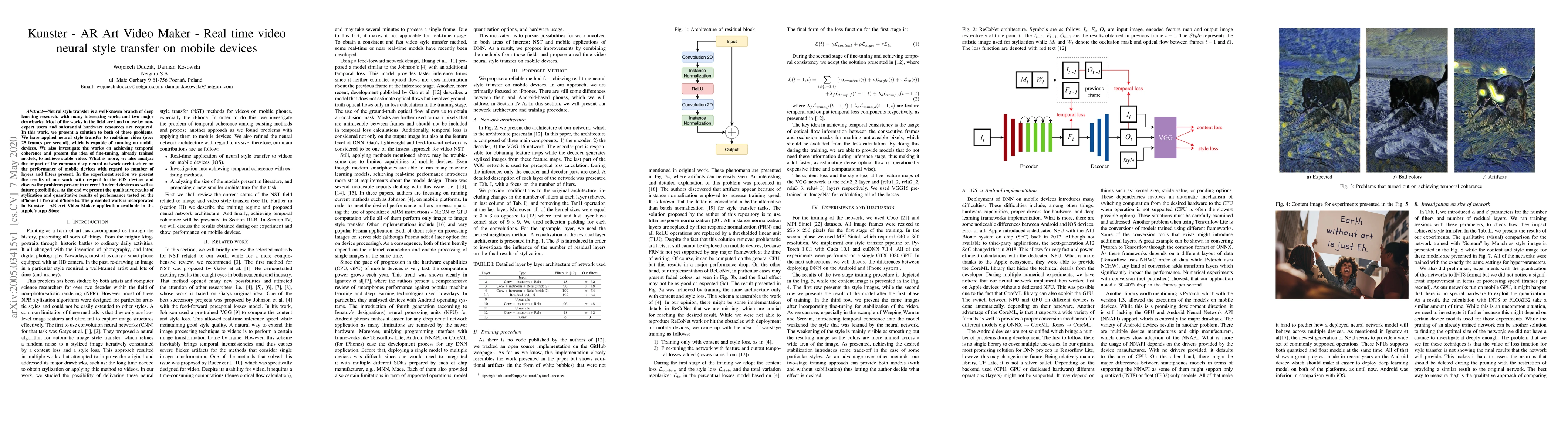 This paper presents Kunster, an AR Art Video Maker app that enables real-time neural style transfer on mobile devices, addressing usability and hardware resource issues. The app achieves temporal coherence through fine-tuning of pre-trained models and analyzes the impact of neural network architecture on mobile performance.