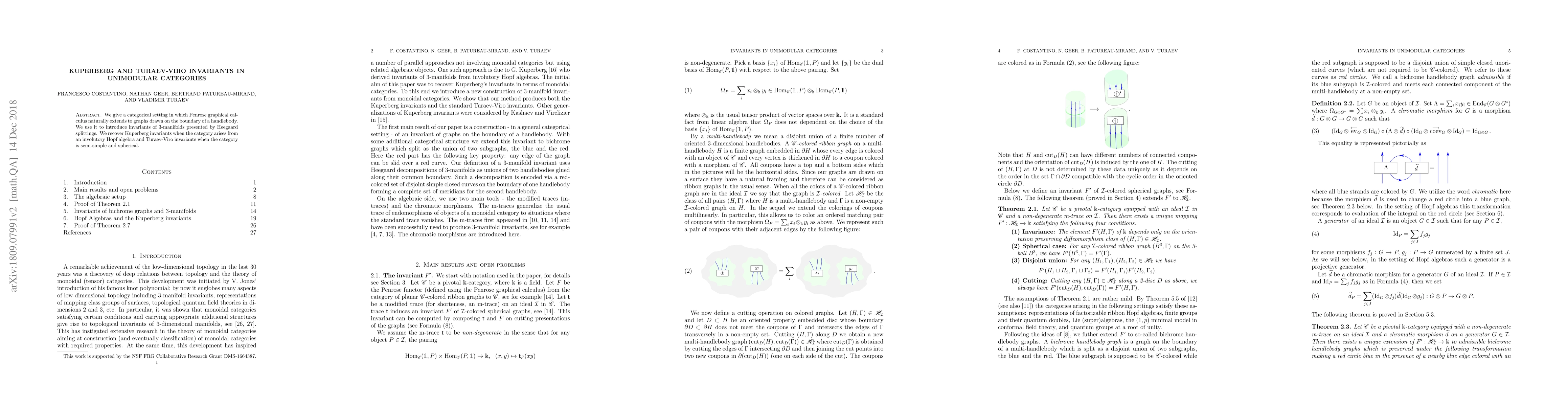 This paper establishes a categorical framework for extending Penrose graphical calculus to graphs on handlebody boundaries, introducing invariants for 3-manifolds via Heegaard splittings, and recovering Kuperberg and Turaev-Viro invariants under specific conditions.