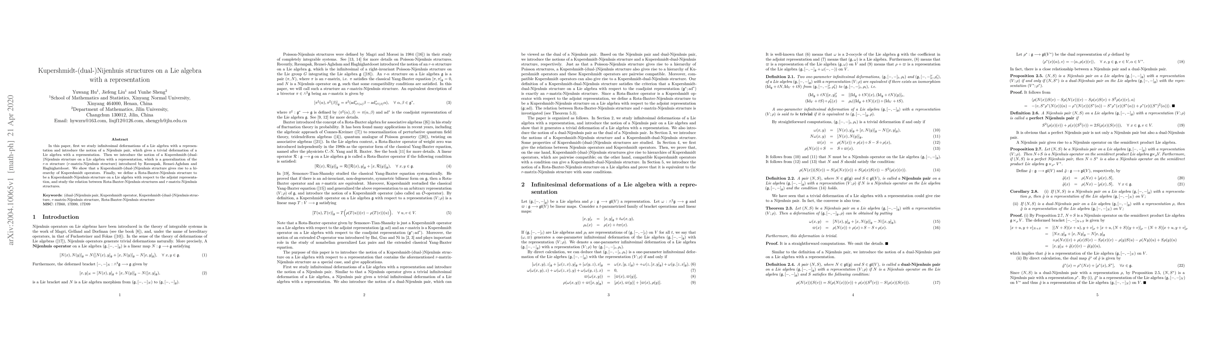 In this paper, first we study infinitesimal deformations of a Lie algebra with a representation and introduce the notion of a Nijenhuis pair, which gives a trivial deformation of a Lie algebra with a representation. Then we introduce the notion of a Kupershmidt-(dual-)Nijenhuis structure on a Lie algebra with a representation, which is a generalization of the $r$-$n$ structure ($r$-matrix-Nijenhuis structure) introduced by Ravanpak, Rezaei-Aghdam and Haghighatdoost. We show that a Kupershmidt-(dual-)Nijenhuis structure gives rise to a hierarchy of Kupershmidt operators. Finally, we define a Rota-Baxter-Nijenhuis structure to be a Kupershmidt-Nijenhuis structure on a Lie algebra with respect to the adjoint representation, and study the relation between Rota-Baxter-Nijenhuis structures and $r$-matrix-Nijenhuis structures.