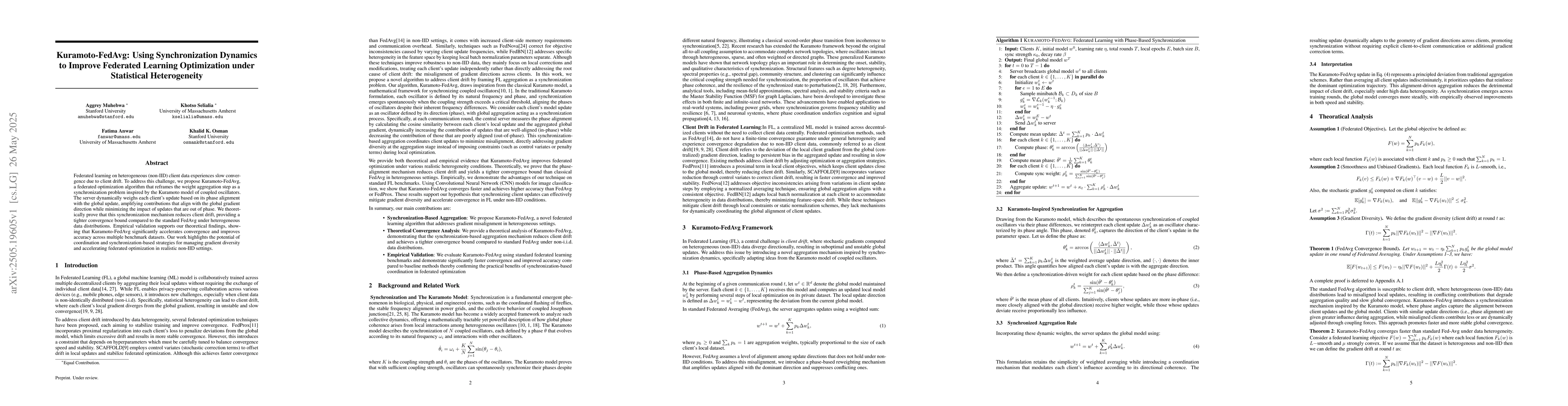 Federated learning on heterogeneous (non-IID) client data experiences slow convergence due to client drift. To address this challenge, we propose Kuramoto-FedAvg, a federated optimization algorithm that reframes the weight aggregation step as a synchronization problem inspired by the Kuramoto model of coupled oscillators. The server dynamically weighs each client's update based on its phase alignment with the global update, amplifying contributions that align with the global gradient direction while minimizing the impact of updates that are out of phase. We theoretically prove that this synchronization mechanism reduces client drift, providing a tighter convergence bound compared to the standard FedAvg under heterogeneous data distributions. Empirical validation supports our theoretical findings, showing that Kuramoto-FedAvg significantly accelerates convergence and improves accuracy across multiple benchmark datasets. Our work highlights the potential of coordination and synchronization-based strategies for managing gradient diversity and accelerating federated optimization in realistic non-IID settings.