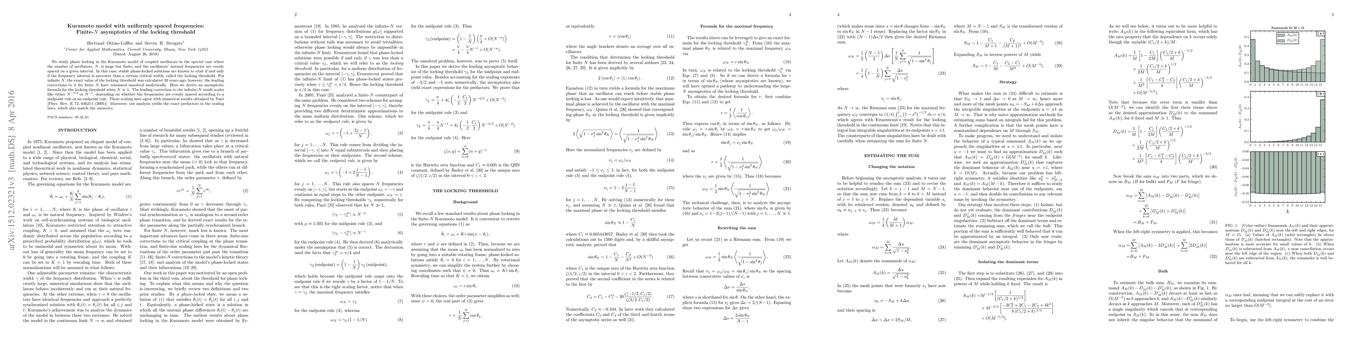 This paper investigates phase locking in the Kuramoto model with uniformly spaced oscillator frequencies, focusing on finite-$N$ asymptotics. It derives an asymptotic formula for the locking threshold, providing leading corrections that scale as $N^{-3/2}$ or $N^{-1}$, depending on the frequency spacing rule, and matches these findings with numerical results.
