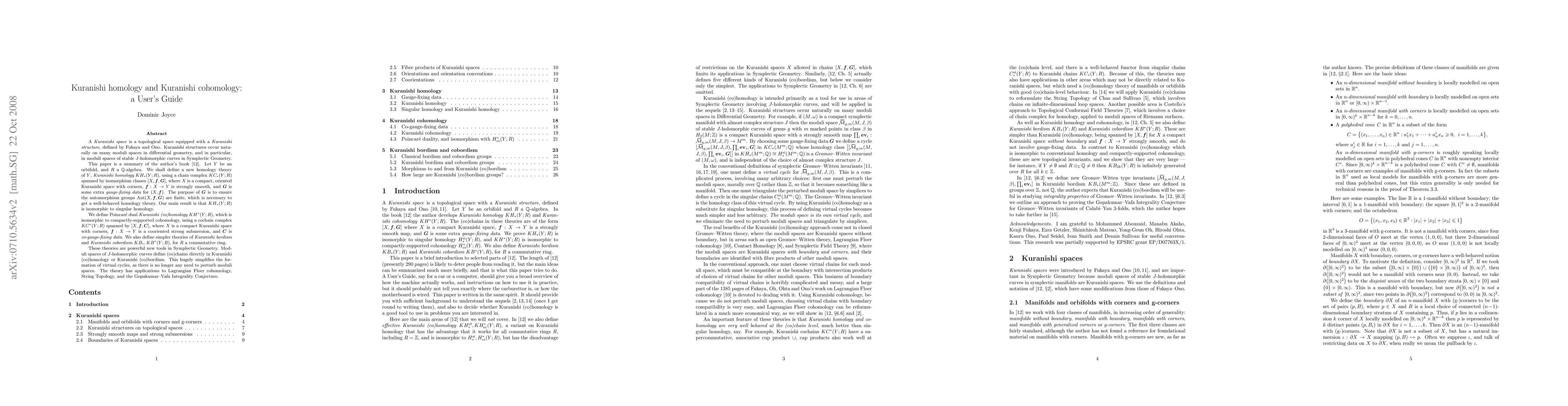 A Kuranishi space is a topological space with a Kuranishi structure, defined by Fukaya and Ono. Kuranishi structures occur naturally on moduli spaces of J-holomorphic curves in symplectic geometry. This paper is a brief introduction to the author's book arXiv:0707.3572. Let Y be an orbifold and R a Q-algebra. We define the Kuranishi homology KH_*(Y;R) of Y with coefficients in R. The chain complex KC_*(Y;R) defining KH_*(Y;R) is spanned over R by [X,f,G], for X a compact oriented Kuranishi space with corners, f : X --> Y smooth, and G "gauge-fixing data" which makes Aut(X,f,G) finite. Our main result is that KH_*(Y;R) is isomorphic to singular homology. We define a Poincare dual theory of Kuranishi cohomology KH^*(Y;R), isomorphic to compactly-supported cohomology, using a cochain complex KC^*(Y;R) spanned over R by [X,f,C], for X a compact Kuranishi space with corners, f : X --> Y a submersion, and C "co-gauge-fixing data". We also define simpler theories of Kuranishi bordism KB_*(Y;R) and Kuranishi cobordism KB^*(Y;R), for R a commutative ring. These are new topological invariants, and we show they are very large. These theories are powerful new tools in symplectic geometry. Defining virtual cycles and chains for moduli spaces of J-holomorphic curves is trivial in Kuranishi (co)homology. There is no need to perturb moduli spaces, and no problems with transversality. This gives major simplifications in Lagrangian Floer cohomology.