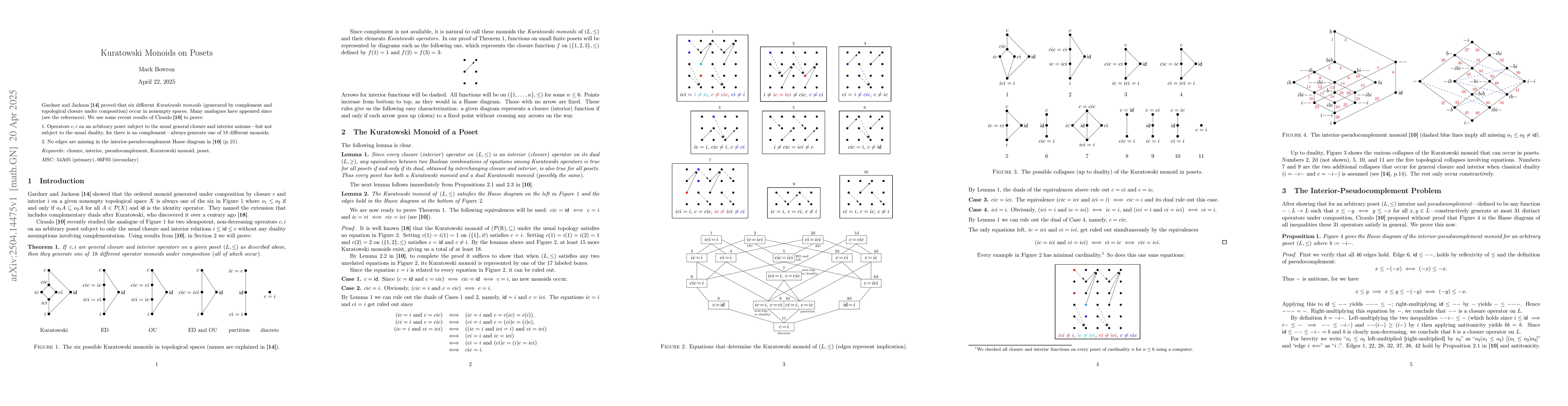 Researchers show that operators on posets generate one of 18 different monoids under composition, and prove a conjecture about the Hasse diagram representing an interior-pseudocomplement monoid.