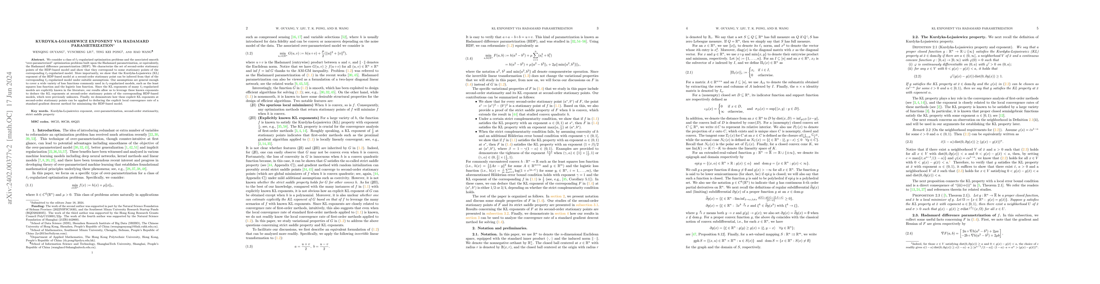 We consider a class of $\ell_1$-regularized optimization problems and the associated smooth "over-parameterized" optimization problems built upon the Hadamard parametrization, or equivalently, the Hadamard difference parametrization (HDP). We characterize the set of second-order stationary points of the HDP-based model and show that they correspond to some stationary points of the corresponding $\ell_1$-regularized model. More importantly, we show that the Kurdyka-Lojasiewicz (KL) exponent of the HDP-based model at a second-order stationary point can be inferred from that of the corresponding $\ell_1$-regularized model under suitable assumptions. Our assumptions are general enough to cover a wide variety of loss functions commonly used in $\ell_1$-regularized models, such as the least squares loss function and the logistic loss function. Since the KL exponents of many $\ell_1$-regularized models are explicitly known in the literature, our results allow us to leverage these known exponents to deduce the KL exponents at second-order stationary points of the corresponding HDP-based models, which were previously unknown. Finally, we demonstrate how these explicit KL exponents at second-order stationary points can be applied to deducing the explicit local convergence rate of a standard gradient descent method for minimizing the HDP-based model.