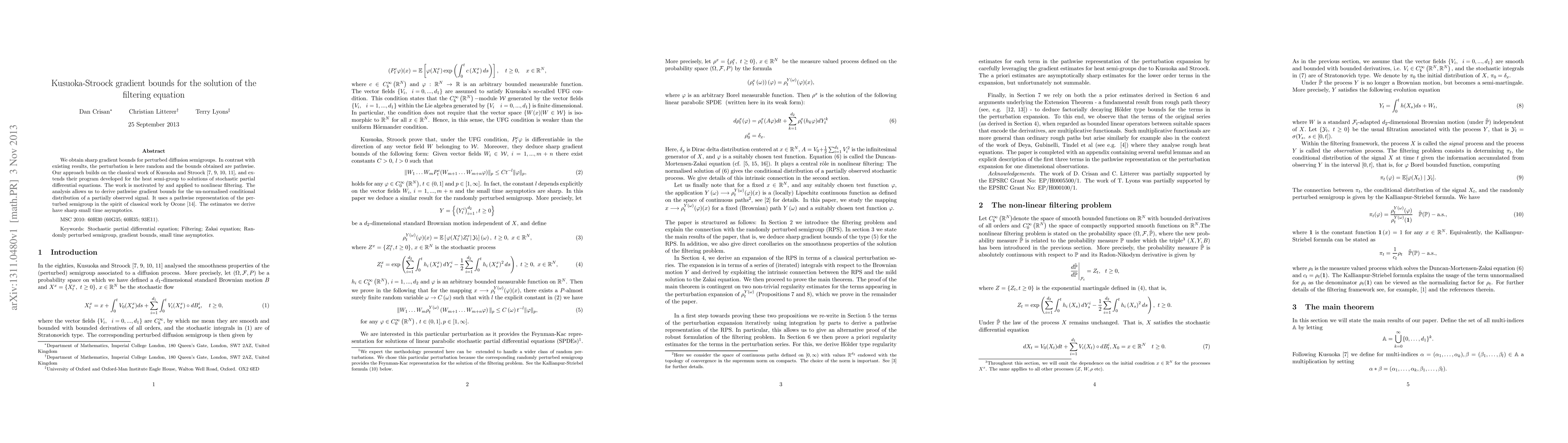 We obtain sharp gradient bounds for perturbed diffusion semigroups. In contrast with existing results, the perturbation is here random and the bounds obtained are pathwise. Our approach builds on the classical work of Kusuoka and Stroock [7],[9],[10],[11], and extends their program developed for the heat semi-group to solutions of stochastic partial differential equations. The work is motivated by and applied to nonlinear filtering. The analysis allows us to derive pathwise gradient bounds for the un-normalised conditional distribution of a partially observed signal. It uses a pathwise representation of the perturbed semigroup in the spirit of classical work by Ocone [14]. The estimates we derive have sharp small time asymptotics.