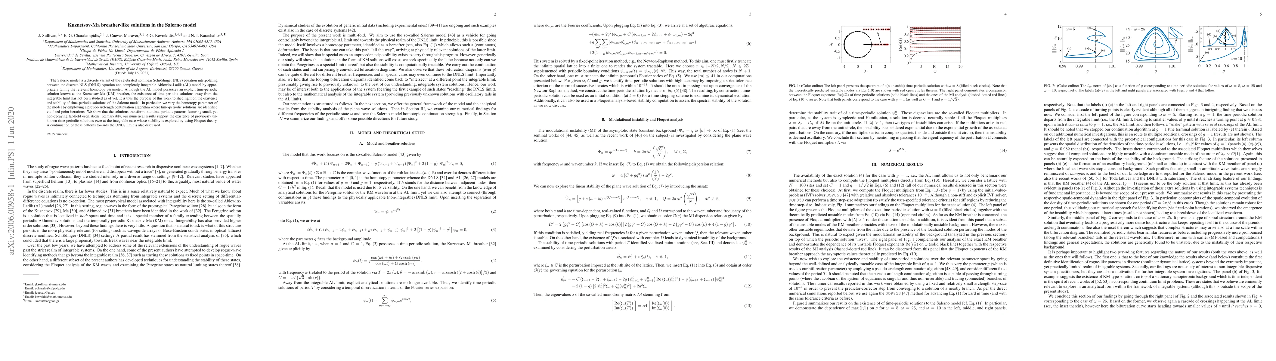 This paper explores the existence and stability of Kuznetsov-Ma breather-like time-periodic solutions in the Salerno model, a discrete variant of the nonlinear Schrödinger equation. Using a pseudo-arclength continuation algorithm, the authors identify new time-periodic solutions with small, non-decaying oscillations, even in the integrable limit, and analyze their stability via Floquet theory.