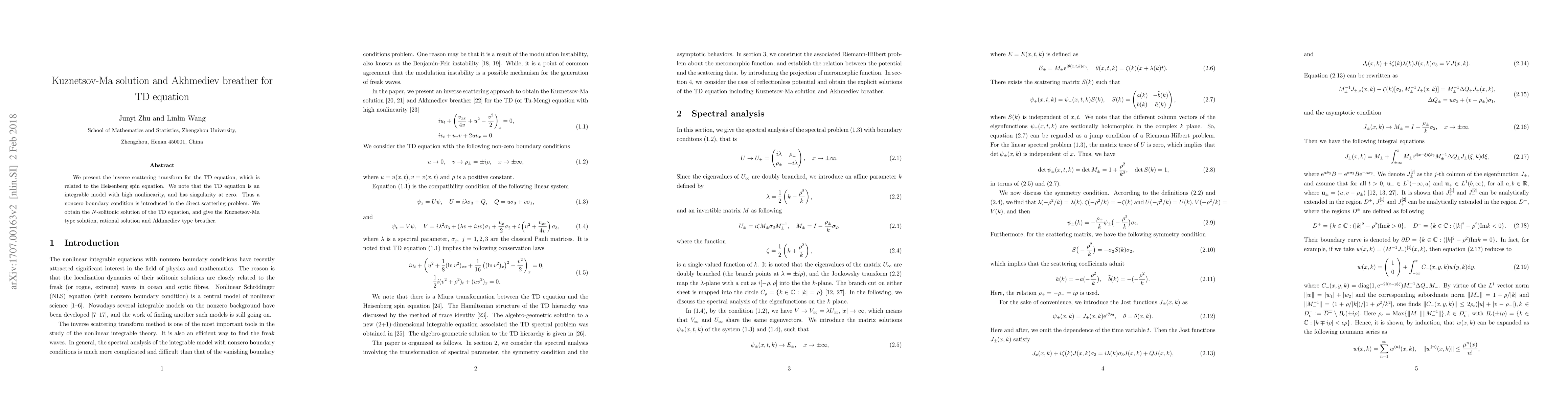 We present the inverse scattering transform for the TD equation, which is related to the Heisenberg spin equation. We note that the TD equation is an integrable model with high nonlinearity, and has singularity at zero. Thus a nonzero boundary condition is introduced in the direct scattering problem. We obtain the $N$-solitonic solution of the TD equation, and give the Kuznetsov-Ma type solution, rational solution and Akhmediev type breather.