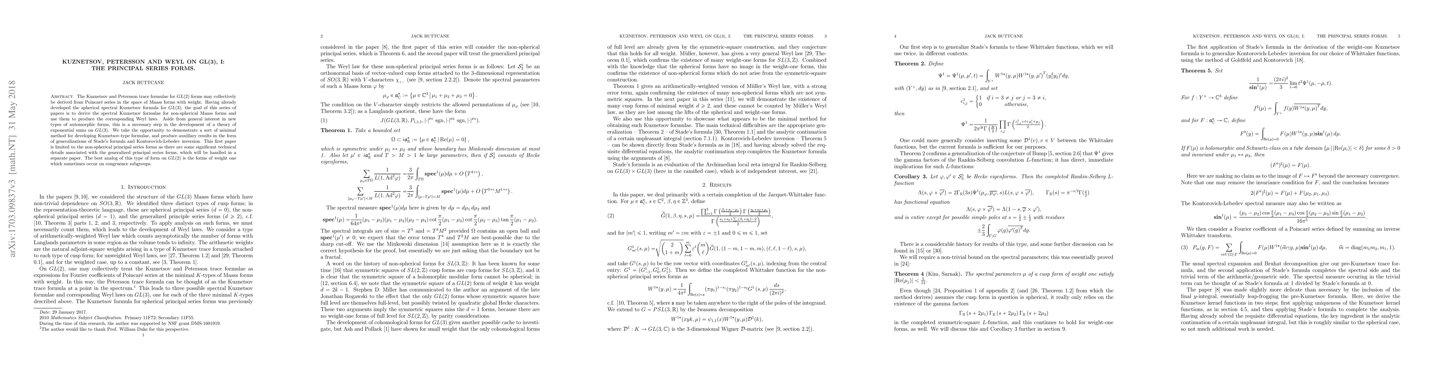 The Kuznetsov and Petersson trace formulae for $GL(2)$ forms may collectively be derived from Poincar\'e series in the space of Maass forms with weight. Having already developed the spherical spectral Kuznetsov formula for $GL(3)$, the goal of this series of papers is to derive the spectral Kuznetsov formulae for non-spherical Maass forms and use them to produce the corresponding Weyl laws; this appears to be the first proof of the existence of such forms not coming from the symmetric-square construction. Aside from general interest in new types of automorphic forms, this is a necessary step in the development of a theory of exponential sums on $GL(3)$. We take the opportunity to demonstrate a sort of minimal method for developing Kuznetsov-type formulae, and produce auxillary results in the form of generalizations of Stade's formula and Kontorovich-Lebedev inversion. This first paper is limited to the non-spherical prinicpal series forms as there are some significant technical details associated with the generalized principal series forms, which will be handled in a separate paper. The best analog of this type of form on $GL(2)$ is the forms of weight one which sometimes occur on congruence subgroups.
