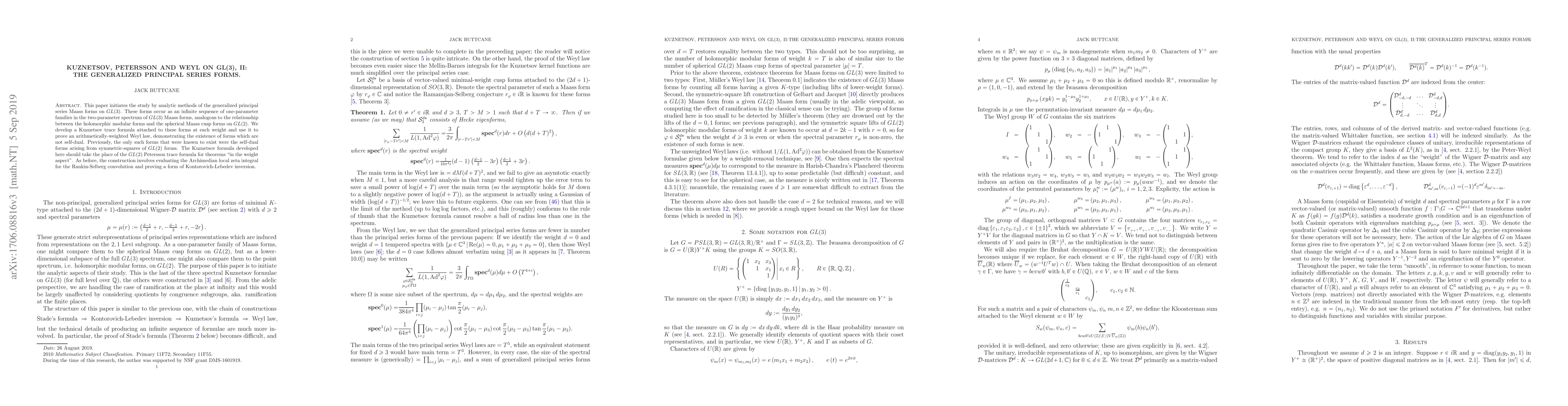 This paper investigates generalized principal series Maass forms on $GL(3)$ using analytic methods, developing a Kuznetsov trace formula to prove an arithmetically-weighted Weyl law and demonstrating the existence of non-self-dual forms, extending beyond previously known self-dual forms. The Kuznetsov formula replaces the $GL(2)$ Petersson trace formula in weight-related theorems.
