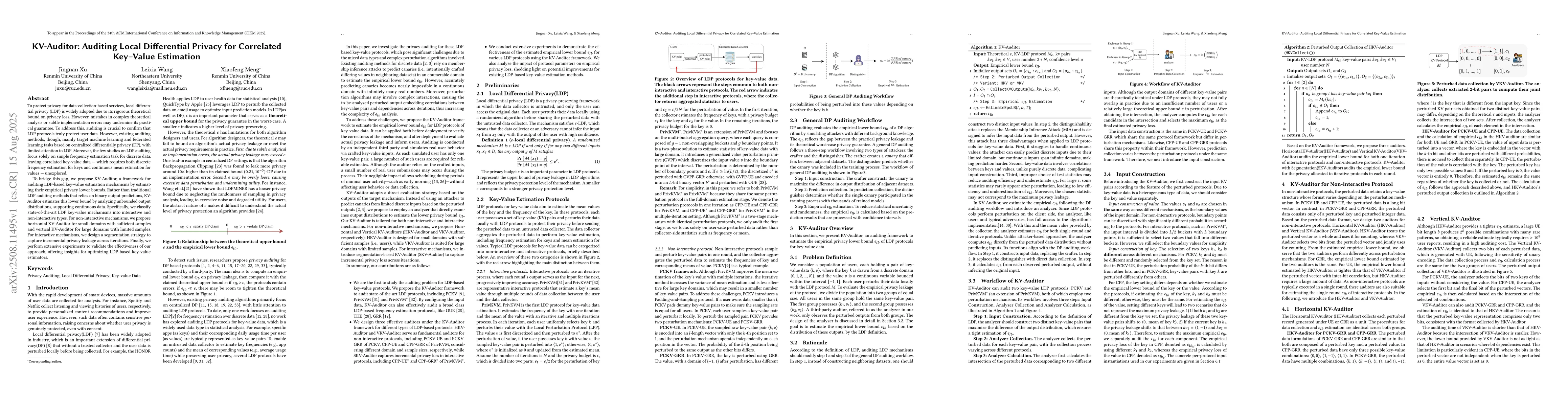 To protect privacy for data-collection-based services, local differential privacy (LDP) is widely adopted due to its rigorous theoretical bound on privacy loss. However, mistakes in complex theoretical analysis or subtle implementation errors may undermine its practical guarantee. To address this, auditing is crucial to confirm that LDP protocols truly protect user data. However, existing auditing methods, though, mainly target machine learning and federated learning tasks based on centralized differentially privacy (DP), with limited attention to LDP. Moreover, the few studies on LDP auditing focus solely on simple frequency estimation task for discrete data, leaving correlated key-value data - which requires both discrete frequency estimation for keys and continuous mean estimation for values - unexplored. To bridge this gap, we propose KV-Auditor, a framework for auditing LDP-based key-value estimation mechanisms by estimating their empirical privacy lower bounds. Rather than traditional LDP auditing methods that relies on binary output predictions, KV-Auditor estimates this lower bound by analyzing unbounded output distributions, supporting continuous data. Specifically, we classify state-of-the-art LDP key-value mechanisms into interactive and non-interactive types. For non-interactive mechanisms, we propose horizontal KV-Auditor for small domains with sufficient samples and vertical KV-Auditor for large domains with limited samples. For interactive mechanisms, we design a segmentation strategy to capture incremental privacy leakage across iterations. Finally, we perform extensive experiments to validate the effectiveness of our approach, offering insights for optimizing LDP-based key-value estimators.
