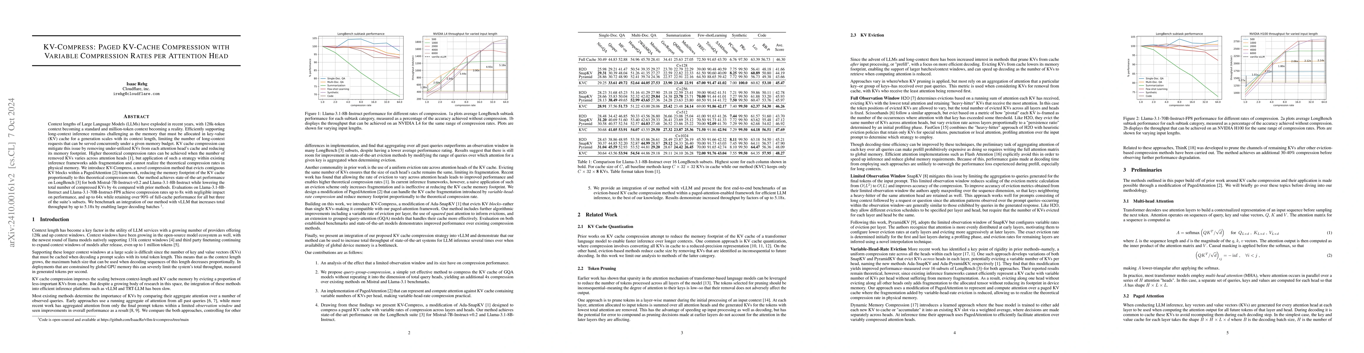 KV-Compress introduces a method for paged KV-cache compression in large language models, achieving up to 8x compression rates with minimal performance loss. It leverages variable compression rates per attention head to maximize efficiency and throughput.