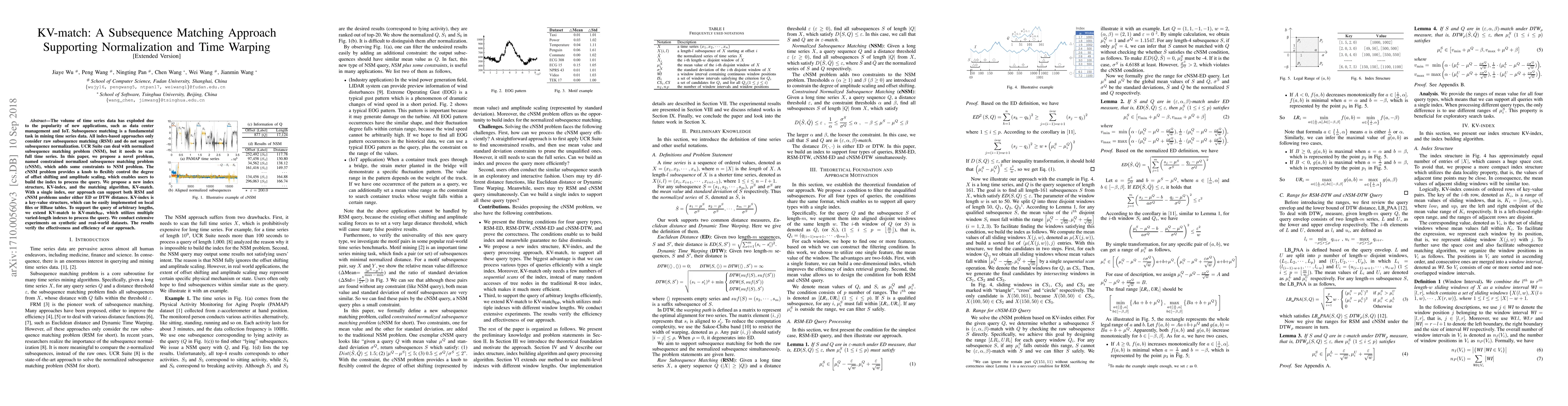 This paper introduces KV-match, a subsequence matching approach that supports both raw subsequence matching and constrained normalized subsequence matching, utilizing a novel KV-index structure. The proposed method efficiently handles queries under ED or DTW distance, and an extended version KV-match$_{DP}$ supports queries of arbitrary lengths. Experimental results demonstrate the effectiveness and efficiency of the proposed method.