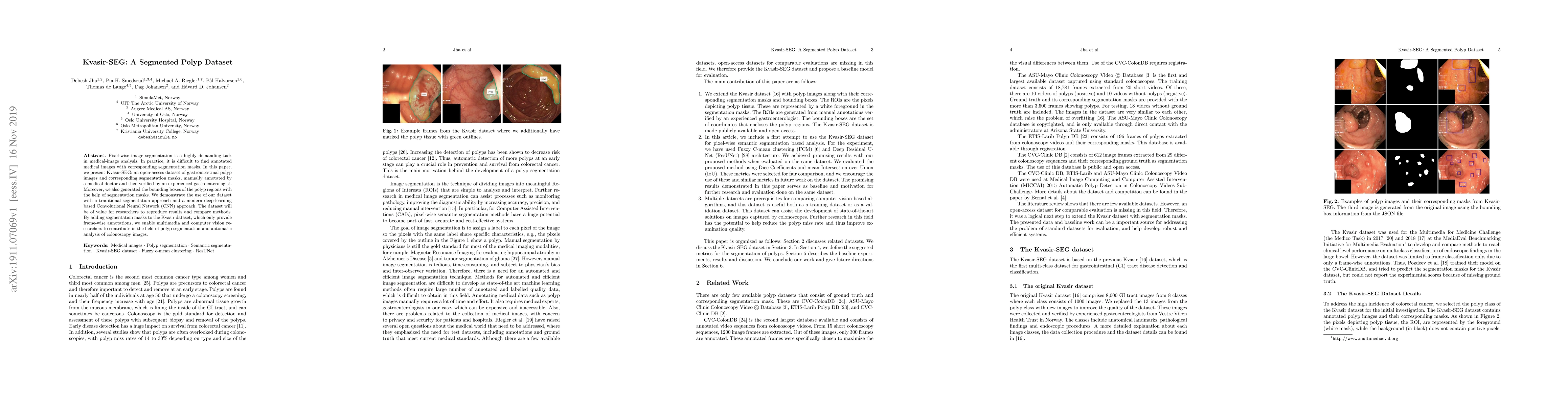 The paper presents Kvasir-SEG, a segmented polyp dataset based on the original Kvasir dataset, enriched with pixel-wise segmentation masks for polyps. The dataset was created using Labelbox for manual annotation by a medical engineer and a gastroenterologist, followed by image augmentation techniques and training a ResUNet model for segmentation.