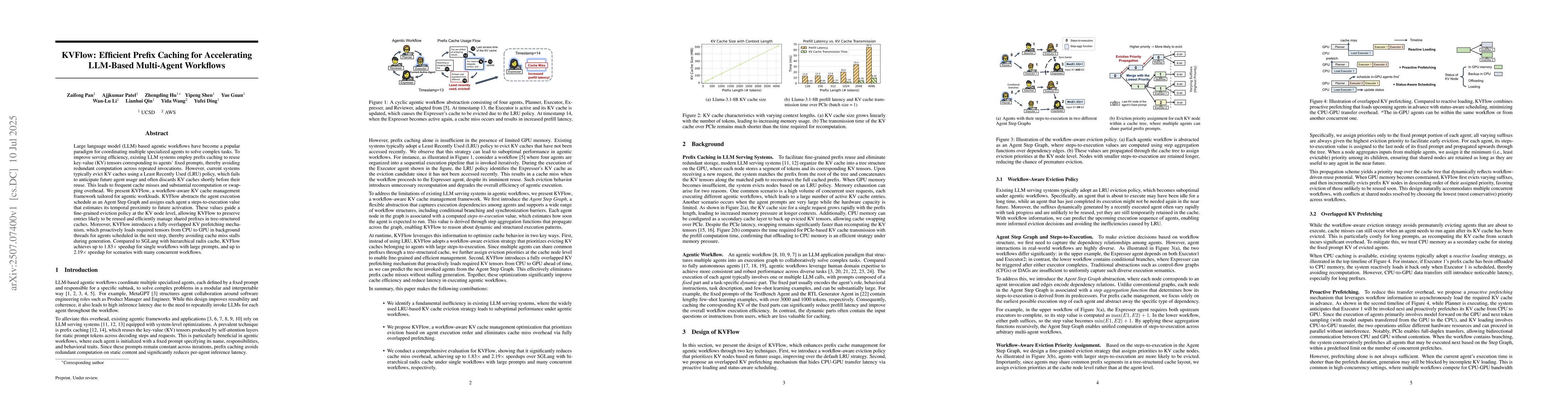 KVFlow is a framework that optimizes Large Language Model (LLM) based multi-agent workflows by implementing a workflow-aware key-value (KV) cache management system. It uses an Agent Step Graph to predict future agent activations, enabling a fine-grained eviction policy that retains valuable cache entries and efficiently handles shared prefixes in tree-structured caches. KVFlow also introduces background KV prefetching to avoid generation stalls, resulting in up to 1.83x speedup for single workflows with large prompts and up to 2.19x speedup for scenarios with many concurrent workflows compared to existing systems.
