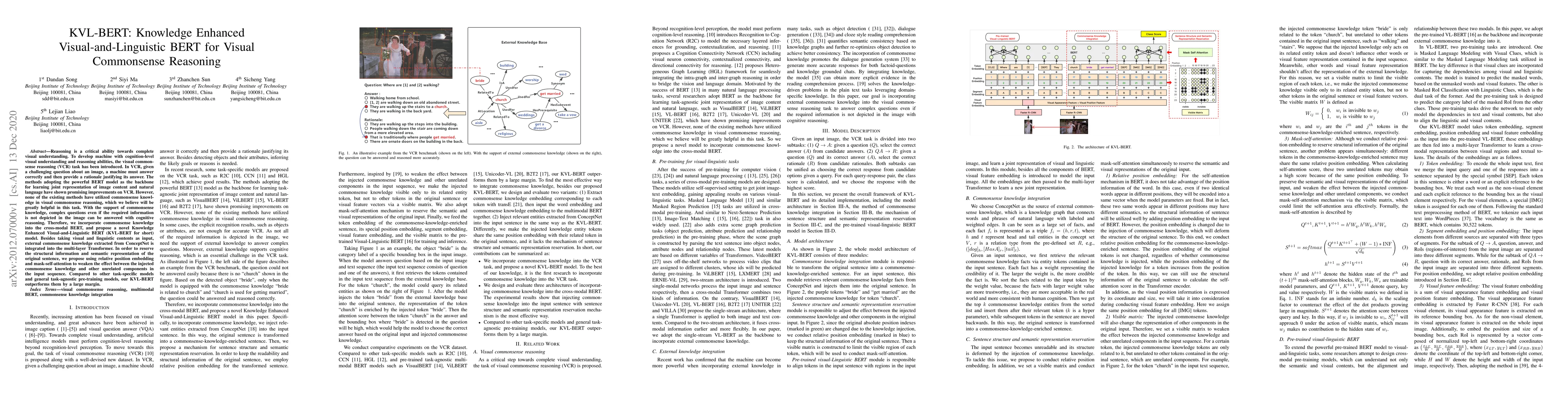 KVL-BERT integrates commonsense knowledge into a visual-and-linguistic BERT model to enhance visual commonsense reasoning, enabling machines to answer complex questions even when the required information isn't depicted in the image. The model outperforms other methods by leveraging external commonsense knowledge and maintaining the structural integrity of the input sentence.