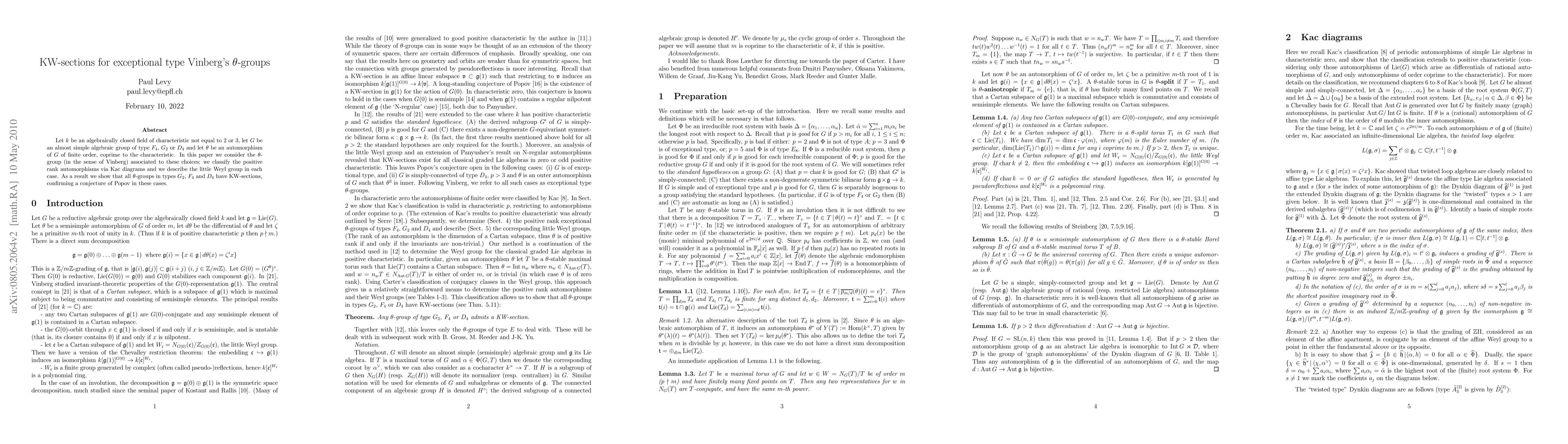 Let $k$ be an algebraically closed field of characteristic not equal to 2 or 3, let $G$ be an almost simple algebraic group of type $F_4$, $G_2$ or $D_4$ and let $\theta$ be an automorphism of $G$ of finite order, coprime to the characteristic. In this paper we consider the $\theta$-group (in the sense of Vinberg) associated to these choices; we classify the positive rank automorphisms and give their Kac diagrams and we describe the little Weyl group in each case. As a result we show that all such $\theta$-groups have KW-sections, confirming a conjecture of Popov in these cases.