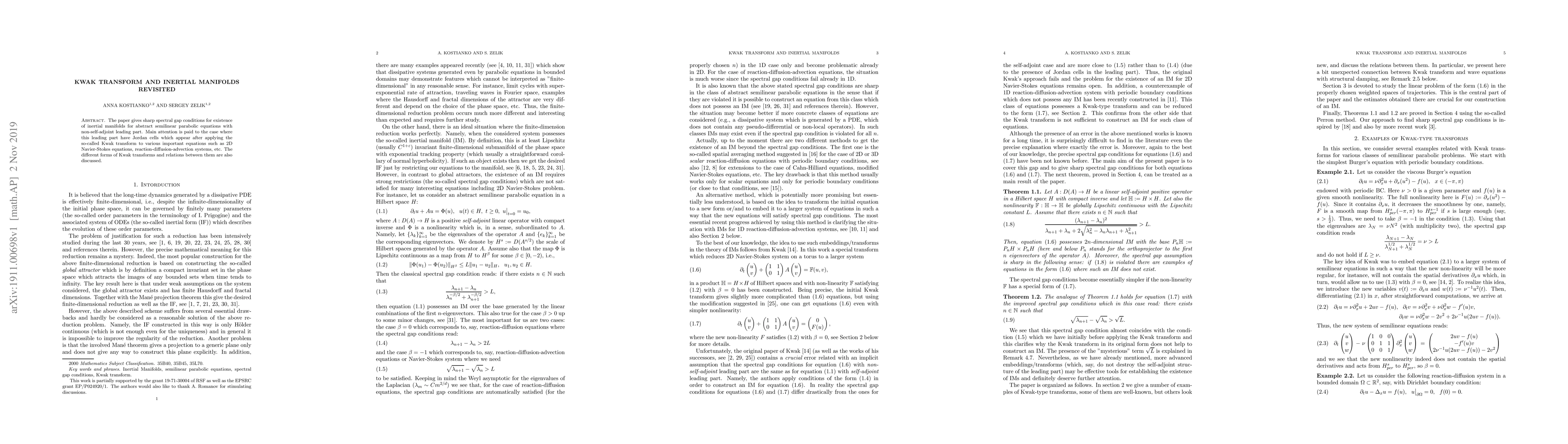 This paper establishes precise spectral gap conditions for inertial manifolds in semilinear parabolic equations, focusing on non-self-adjoint leading parts with Jordan cells after Kwak transform. It explores various Kwak transforms and their applications to equations like 2D Navier-Stokes and reaction-diffusion-advection systems.