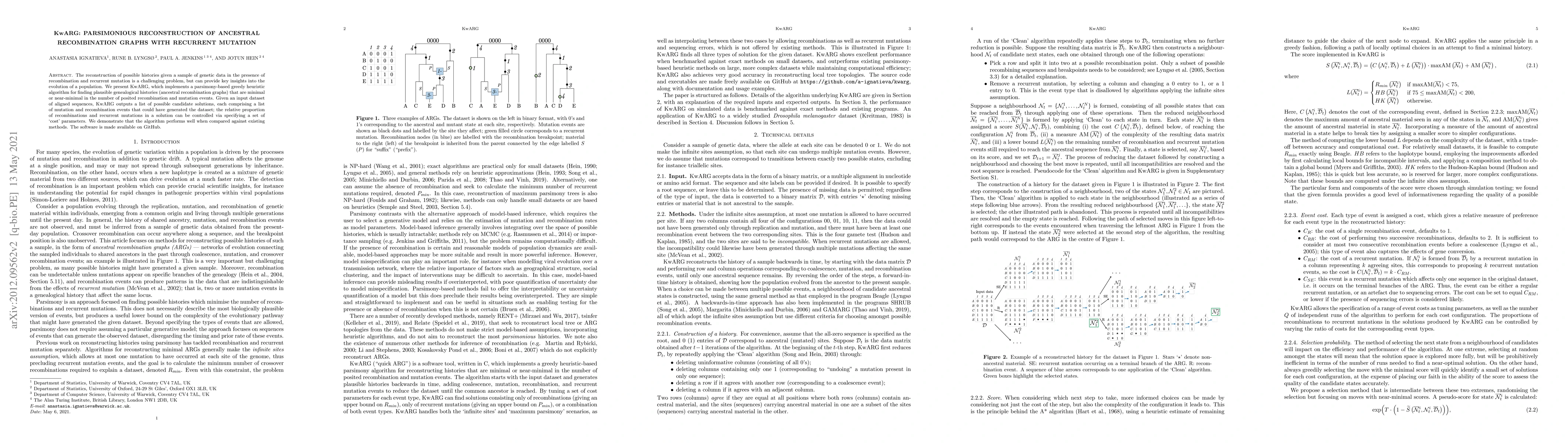 The reconstruction of possible histories given a sample of genetic data in the presence of recombination and recurrent mutation is a challenging problem, but can provide key insights into the evolution of a population. We present KwARG, which implements a parsimony-based greedy heuristic algorithm for finding plausible genealogical histories (ancestral recombination graphs) that are minimal or near-minimal in the number of posited recombination and mutation events. Given an input dataset of aligned sequences, KwARG outputs a list of possible candidate solutions, each comprising a list of mutation and recombination events that could have generated the dataset; the relative proportion of recombinations and recurrent mutations in a solution can be controlled via specifying a set of 'cost' parameters. We demonstrate that the algorithm performs well when compared against existing methods. The software is made available on GitHub.