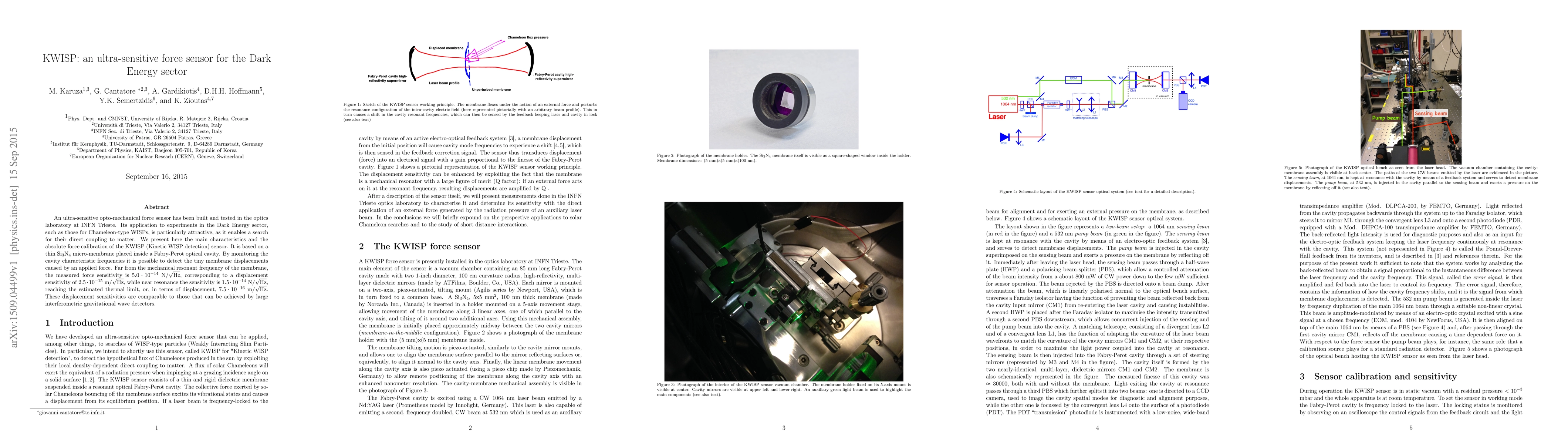 An ultra-sensitive opto-mechanical force sensor has been built and tested in the optics laboratory at INFN Trieste. Its application to experiments in the Dark Energy sector, such as those for Chameleon-type WISPs, is particularly attractive, as it enables a search for their direct coupling to matter. We present here the main characteristics and the absolute force calibration of the KWISP (Kinetic WISP detection) sensor. It is based on a thin Si3N4 micro-membrane placed inside a Fabry-Perot optical cavity. By monitoring the cavity characteristic frequencies it is possible to detect the tiny membrane displacements caused by an applied force. Far from the mechanical resonant frequency of the membrane, the measured force sensitivity is 5.0e-14 N/sqrt(Hz), corresponding to a displacement sensitivity of 2.5e-15 m/sqrt(Hz), while near resonance the sensitivity is 1.5e-14 N/sqrt(Hz), reaching the estimated thermal limit, or, in terms of displacement, 7.5e-16 N/sqrt(Hz). These displacement sensitivities are comparable to those that can be achieved by large interferometric gravitational wave detectors.