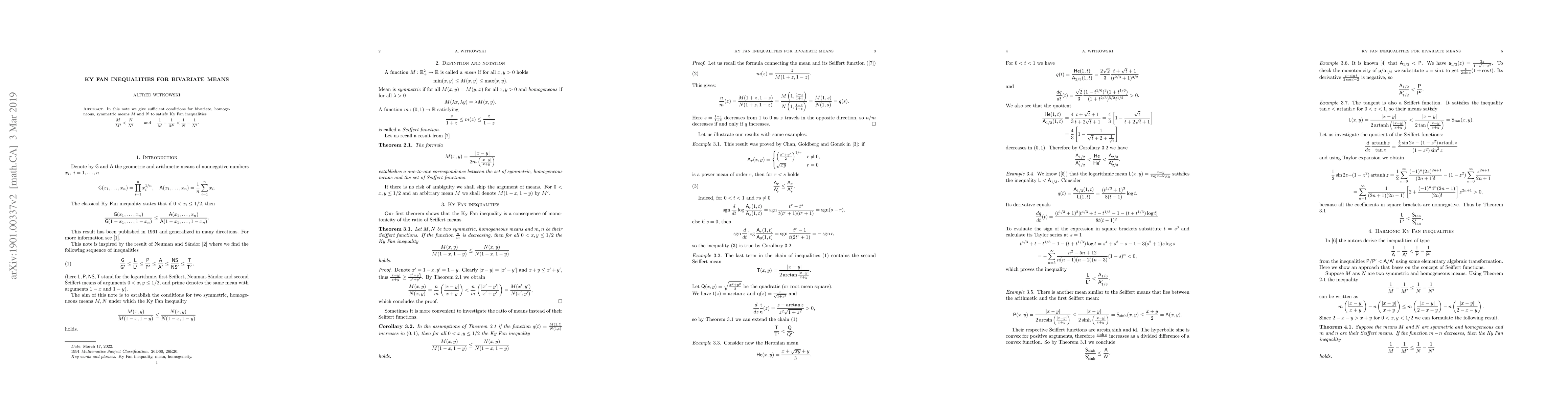 In this note we give sufficient conditions for bivariate, homogeneous, symmetric means $M$ and $N$ to satisfy Ky Fan inequalities $$\frac{M}{M'}<\frac{N}{N'}\qquad\text{ and }\quad \frac{1}{M}-\frac{1}{M'}<\frac{1}{N}-\frac{1}{N'}.$$