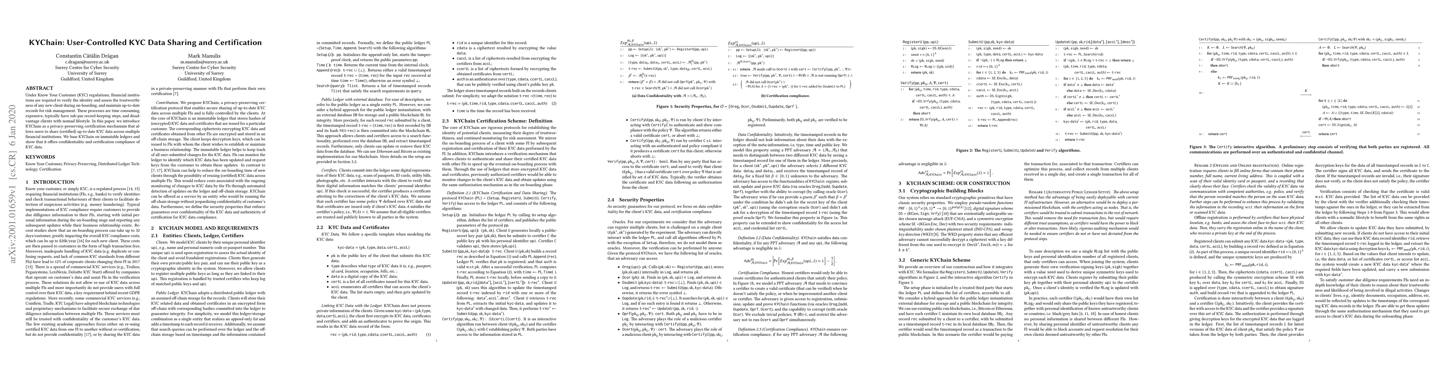 Under Know Your Customer (KYC) regulations, financial institutions are required to verify the identity and assess the trustworthiness of any new client during on-boarding, and maintain up-to-date records for risk management. These processes are time consuming, expensive, typically have sub-par record-keeping steps, and disadvantage clients with nomad lifestyle. In this paper, we introduce KYChain as a privacy-preserving certification mechanism that allows users to share (certified) up-to-date KYC data across multiple financial institutions. We base KYChain on immutable ledgers and show that it offers confidentiality and certification compliance of KYC data.