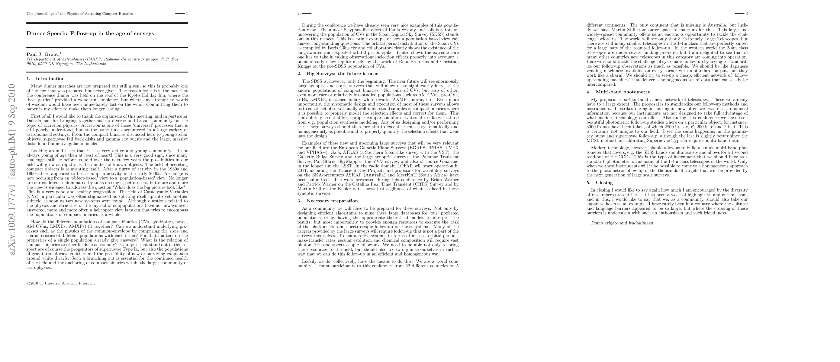 Future big surveys are going to provide many targets of rare compact binary populations that will require photometric and spectroscopic follow-up to use them to answer questions on the formation and evolution of compact binaries, their space densities and the connection to other astrophysical phenomena such as Supernovae Type Ia and the populations of gravitational wave emitters. Now is the time to start preparing efficient follow-up strategies for upcoming static and synoptic surveys. The proposal is to develop a standard photometer that will facilitate a homogeneous multi-band follow-up strategy.