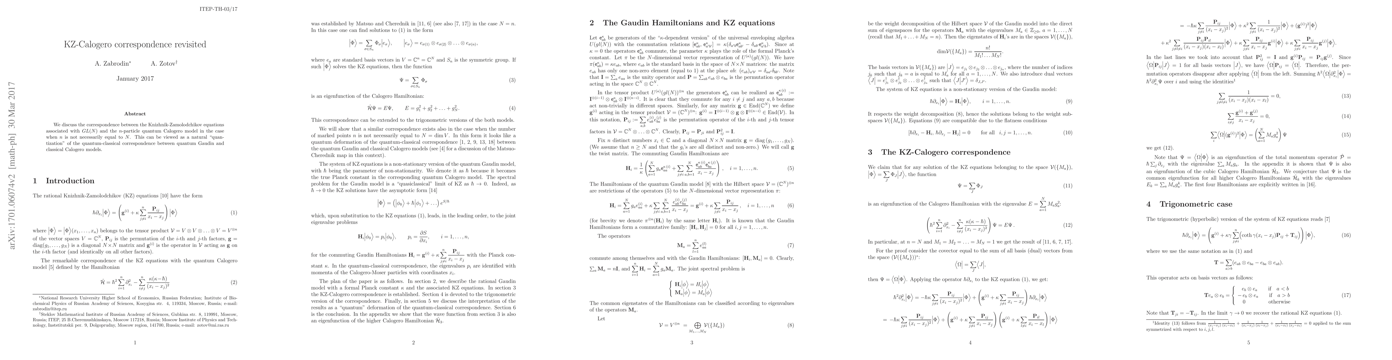 We discuss the correspondence between the Knizhnik-Zamolodchikov equations associated with $GL(N)$ and the $n$-particle quantum Calogero model in the case when $n$ is not necessarily equal to $N$. This can be viewed as a natural "quantization" of the quantum-classical correspondence between quantum Gaudin and classical Calogero models.