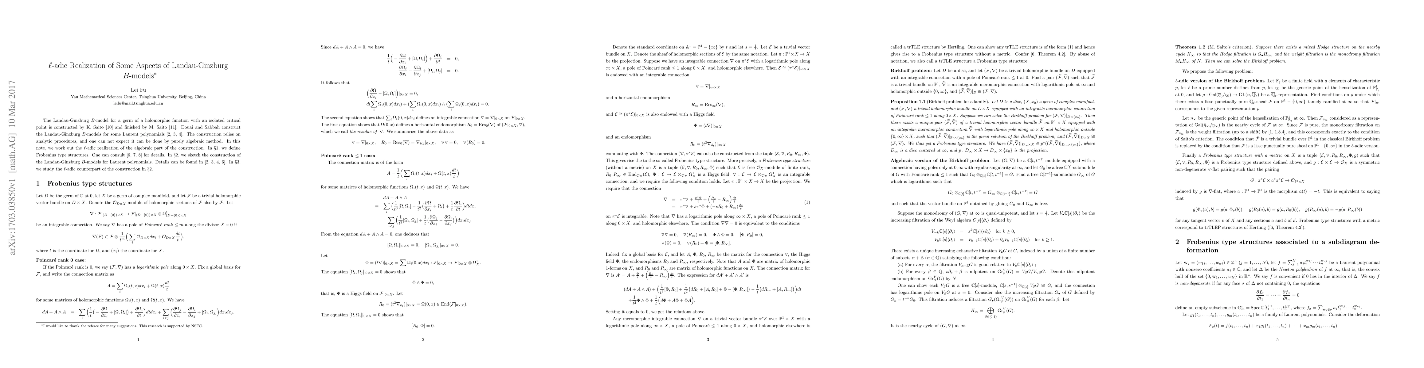 The Landau-Ginzburg B-model for a germ of a holomorphic function with an isolated critical point is constructed by K. Saito and finished by M. Saito. Douai and Sabbah construct the Landau-Ginzburg B-models for some Laurent polynomials. The construction relies on analytic procedures, and one can not expect it can be done by purely algebraic method. In this note, we work out the l-adic realization of the algebraic part of the construction.