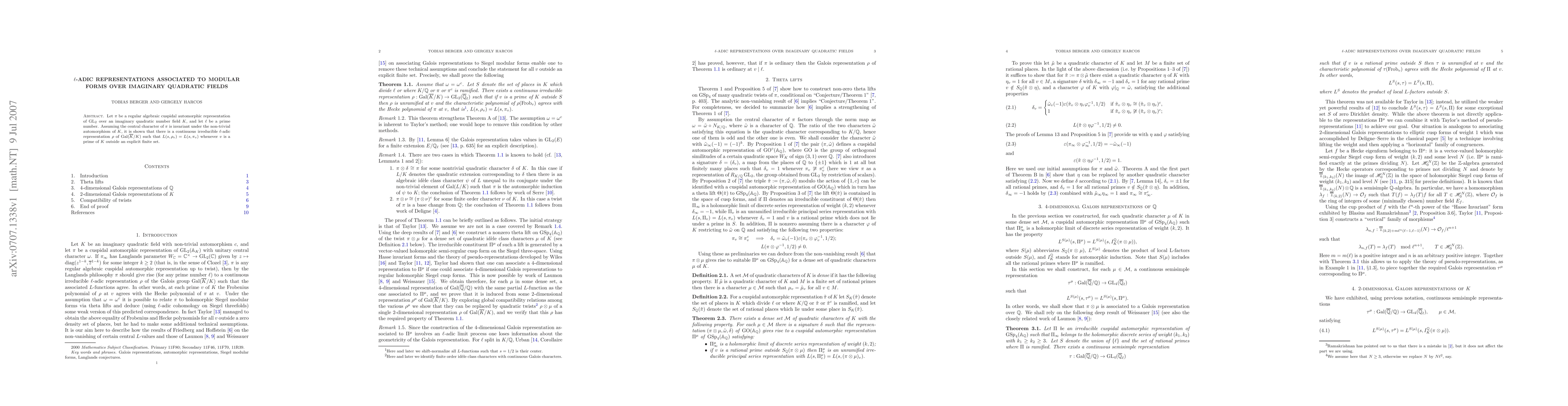 Let pi be a regular algebraic cuspidal automorphic representation of GL(2) over an imaginary quadratic number field K such that the central character of pi is invariant under the non-trivial automorphism of K. We show that pi is associated with an l-adic Galois representation rho over K such that at each prime of K outside an explicit finite set the Frobenius polynomial of rho agrees with the Hecke polynomial of pi.